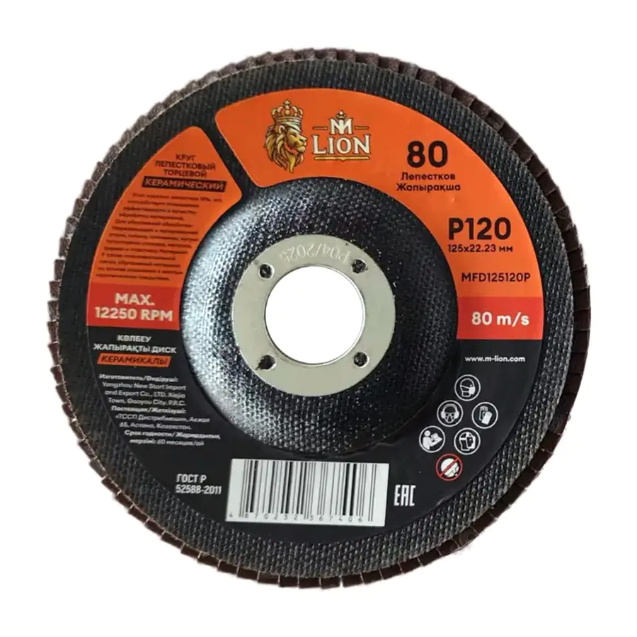 Круг лепестковый торцевой M-Lion 125 х 22,2 мм P120 – угол наклона лепестков диска 15%, что способствует повышению эффективности и качеству обработки материалов. Подходит для абразивной обработки: нержавеющей и легированной стали, титана, алюминия, чугуна, тугоплавких сплавов, металла, дерева и пластика. Материал: 9 слоев стекловолоконной сетки, абразивный материал на основе алюминия с желтым керамическим покрытием.