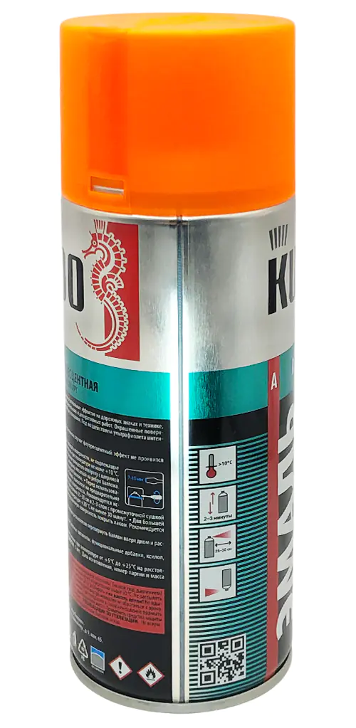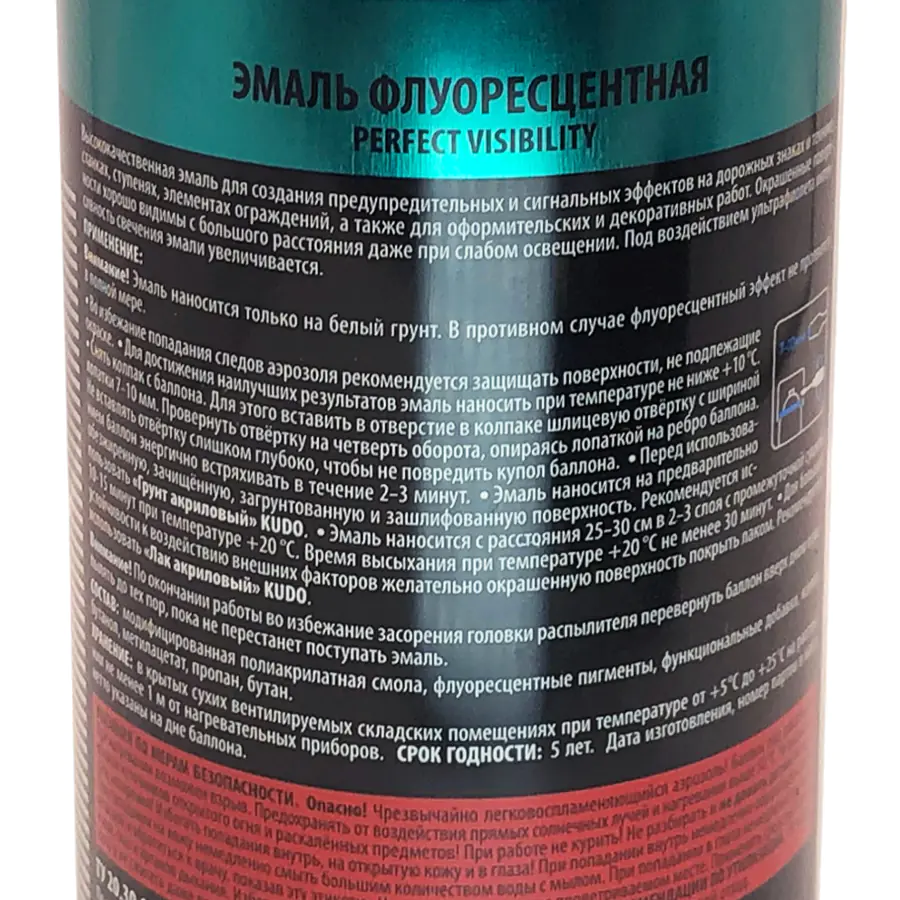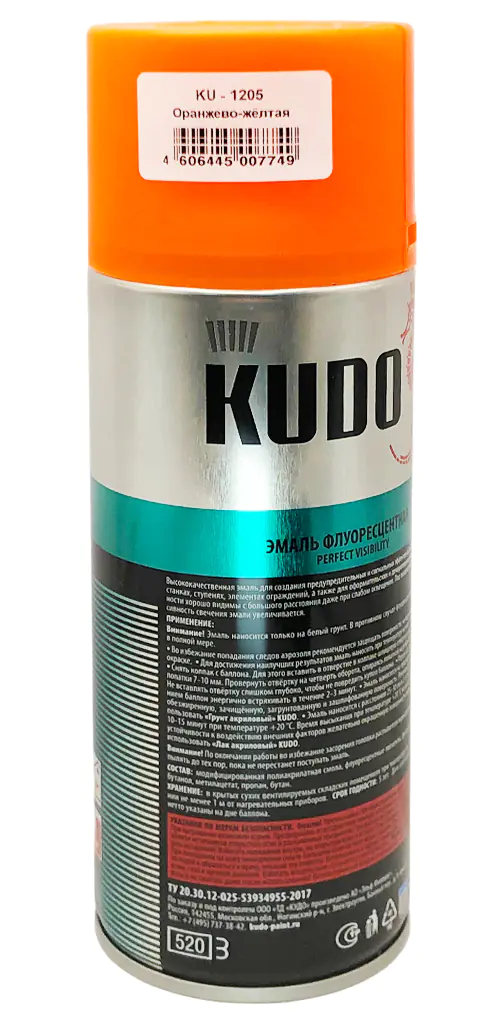 Флуоресцентная эмаль KUDO оранжево-желтая используется для создания предупредительных и сигнальных эффектов на дорожных знаках и технике, станках, ступенях, элементах ограждений. Благодаря аэрозольному распылению легко наносится в труднодоступных местах. Продукт со светоотражающей способностью применяют во время оформительских работ для декоративного окрашивания различных предметов. При ультрафиолетовом облучении интенсивность свечения состава увеличивается.