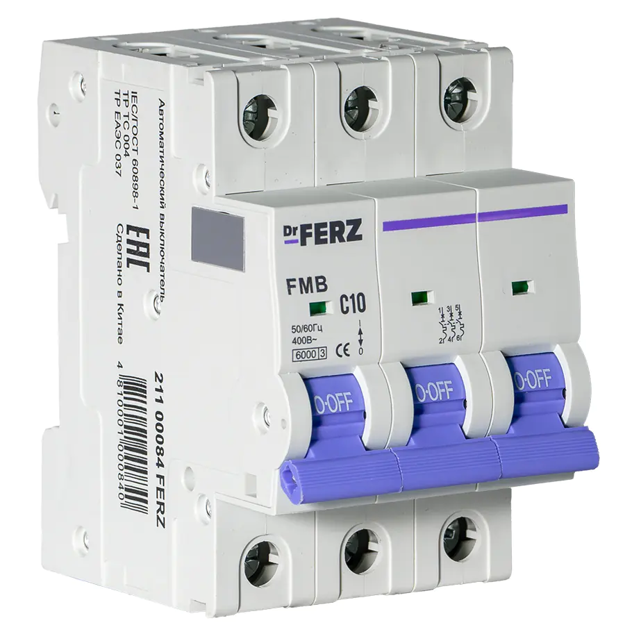 Автоматические выключатели Dr.FERZ 6kA 3P 10A тип С серии FMB – надёжное решение для защиты электрических цепей от перегрузок и коротких замыканий. Устройства рассчитаны на работу в сетях переменного тока с напряжением 230/400 В и частотой 50/60 Гц. Подходят для установки в распределительных щитах жилых, коммерческих и промышленных объектов, обеспечивают безопасное управление цепями и соответствуют современным стандартам электробезопасности.
