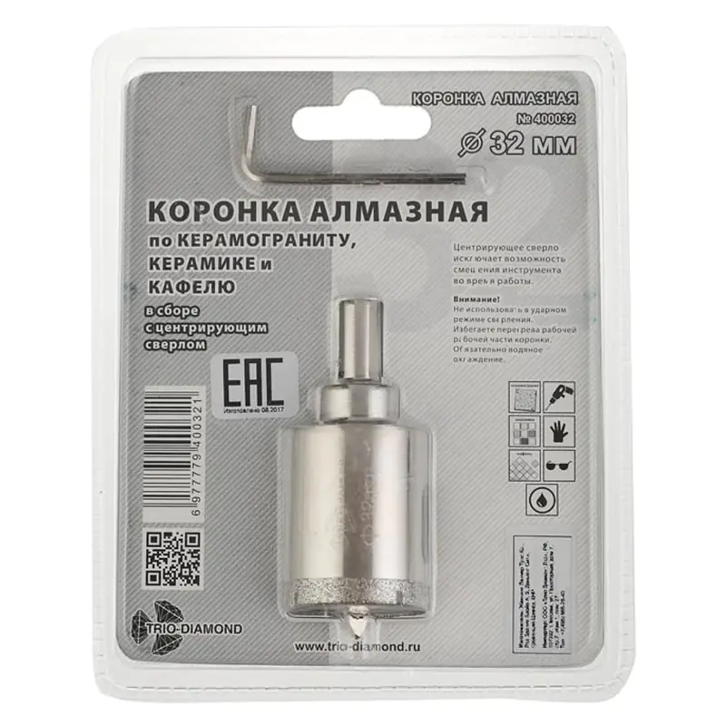 Коронка алмазная 32 мм Trio-Diamond для работы с водяным охлаждением в безударном режиме сверления по керамике и кафелю. Поставляется в сборе с центрирующим сверлом.