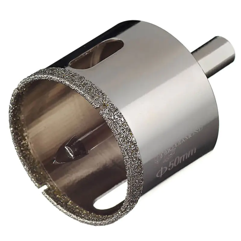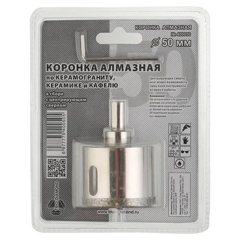 Коронка алмазная 50 мм Trio-Diamond для работы с водяным охлаждением в безударном режиме сверления по керамике и кафелю. Поставляется в сборе с центрирующим сверлом.