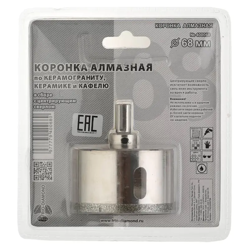 Коронка алмазная 68 мм Trio-Diamond для работы с водяным охлаждением в безударном режиме сверления по керамике и кафелю. Поставляется в сборе с центрирующим сверлом.