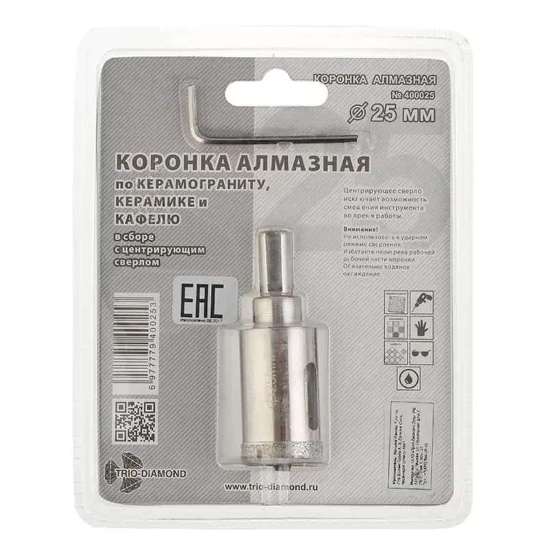 Коронка алмазная 25 мм Trio-Diamond для работы с водяным охлаждением в безударном режиме сверления по керамике и кафелю. Поставляется в сборе с центрирующим сверлом.