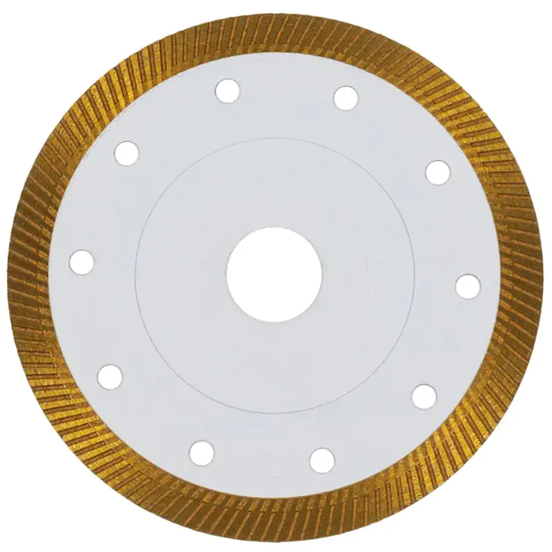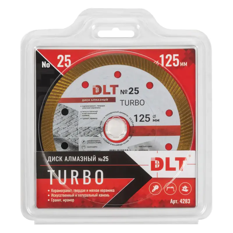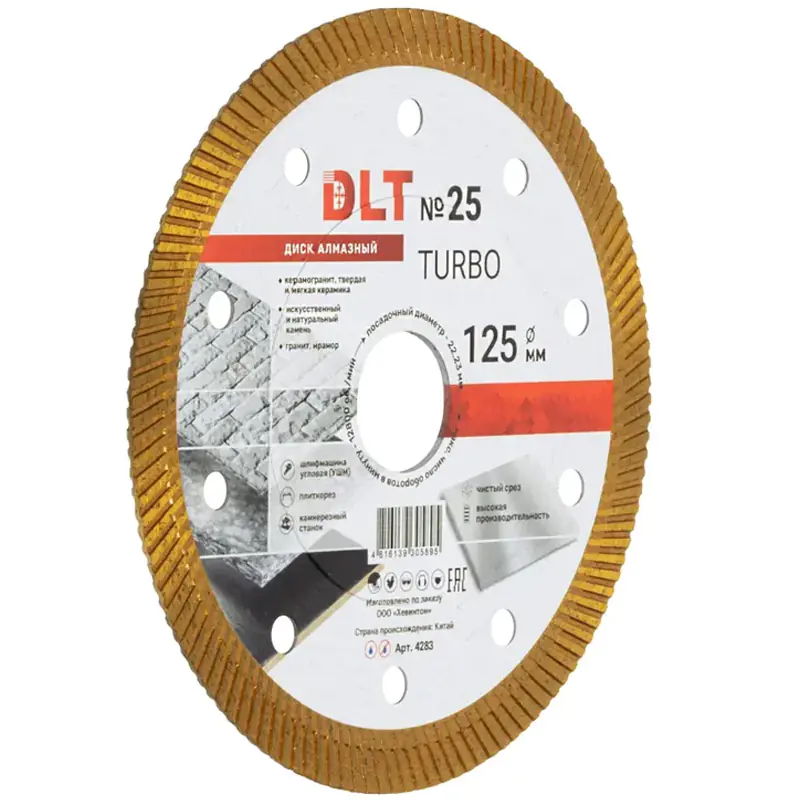 Алмазный диск DLT №25 TURBO – это один из лучших дисков для резки керамогранита УШМ, а также на электрических высокооборотистых станках. Его уменьшенная толщина и диаметр позволяет осуществлять прямую резку на высокой скорости. Этот диск не рекомендуется для резки под углом с большой скоростью – уменьшайте скорость при заусовке! Этот алмазный диск сочетает в себе все хорошее в турбо-диске с преимуществами алмазной полосы, специально разработанной для снижения внутреннего напряжения обрабатываемого материала и уменьшение сколов.