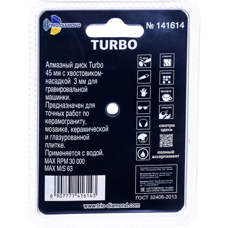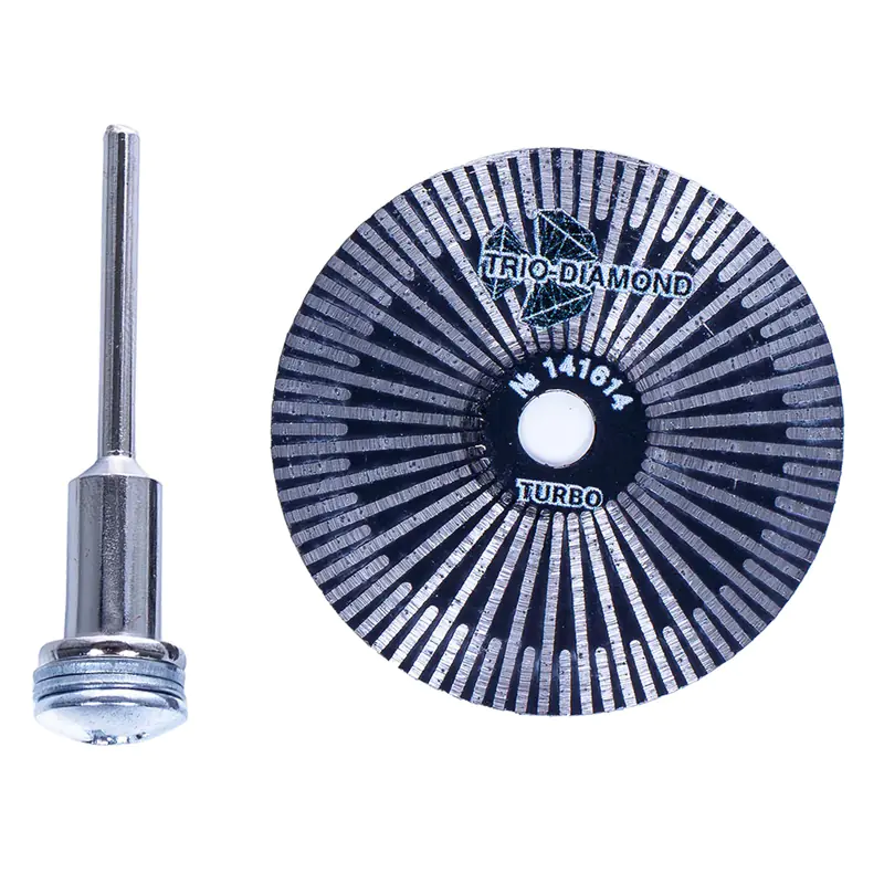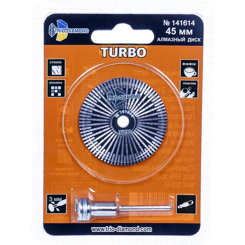 Диск алмазный турбо 45 мм для гравировальной машинки TRIO-DIAMOND 141614 предназначен для керамогранита, кафеля, фарфоровой плитки, стеклянных и пластиковых поверхностей, мозаичных элементов. Монолитный алмазный турбо диск толщиной 0,6 мм и диаметром 45 мм с насадкой хвостовиком 3 мм. Конструкция диска выполнена единым сегментом, что увеличивает срок службы инструмента и расширяет спектр возможностей в обработке материала. Технология производства: горячее прессование.