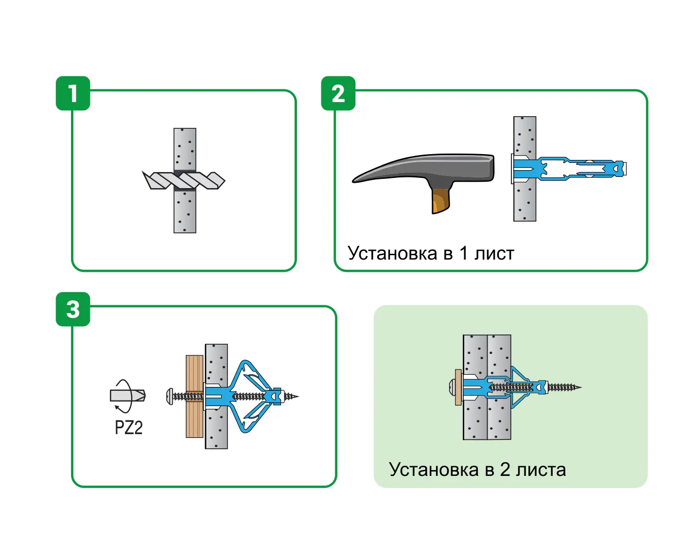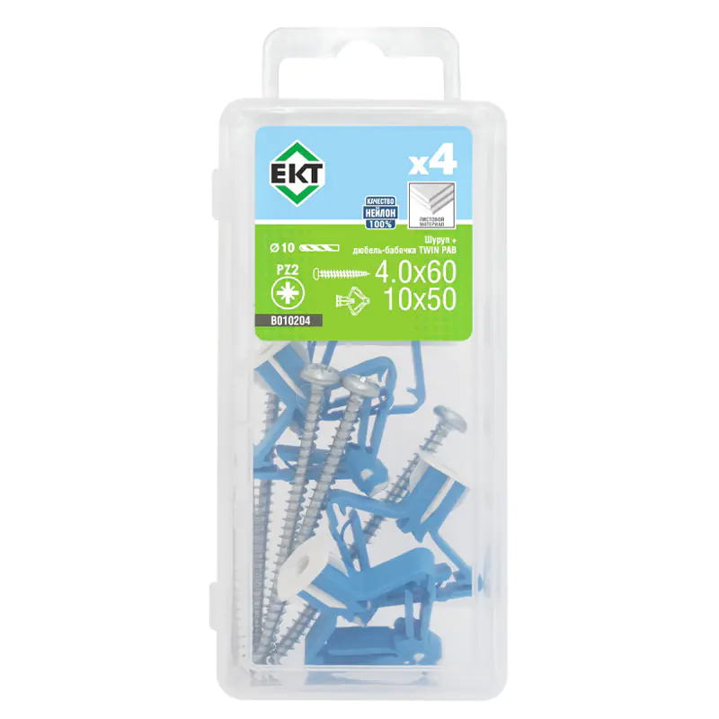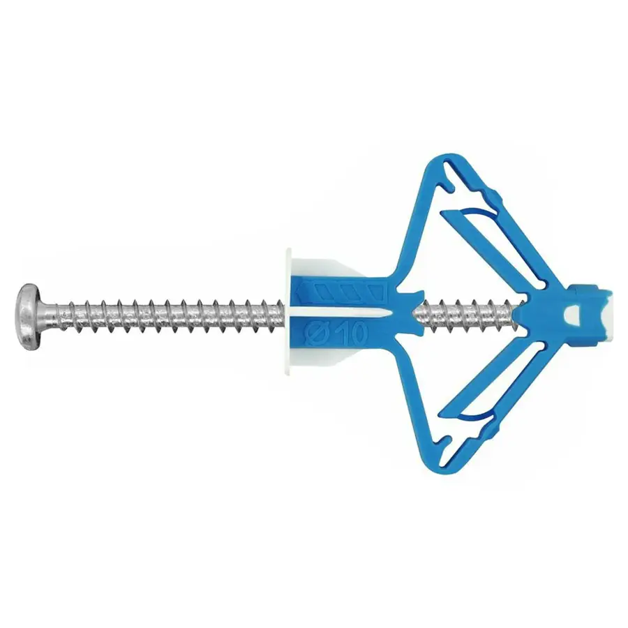 Дюбель-бабочка TWIN PAB предназначен для прочного и безопасного монтажа в гипсокартон однородный и двойной. За счет раскрывающегося механизма дюбель образует устойчивый упор с обратной стороны листа, равномерно распределяя нагрузку и исключая вырывание. Идеален для крепления: навесных шкафчиков и полок, карнизов, зеркал, элементов декора.