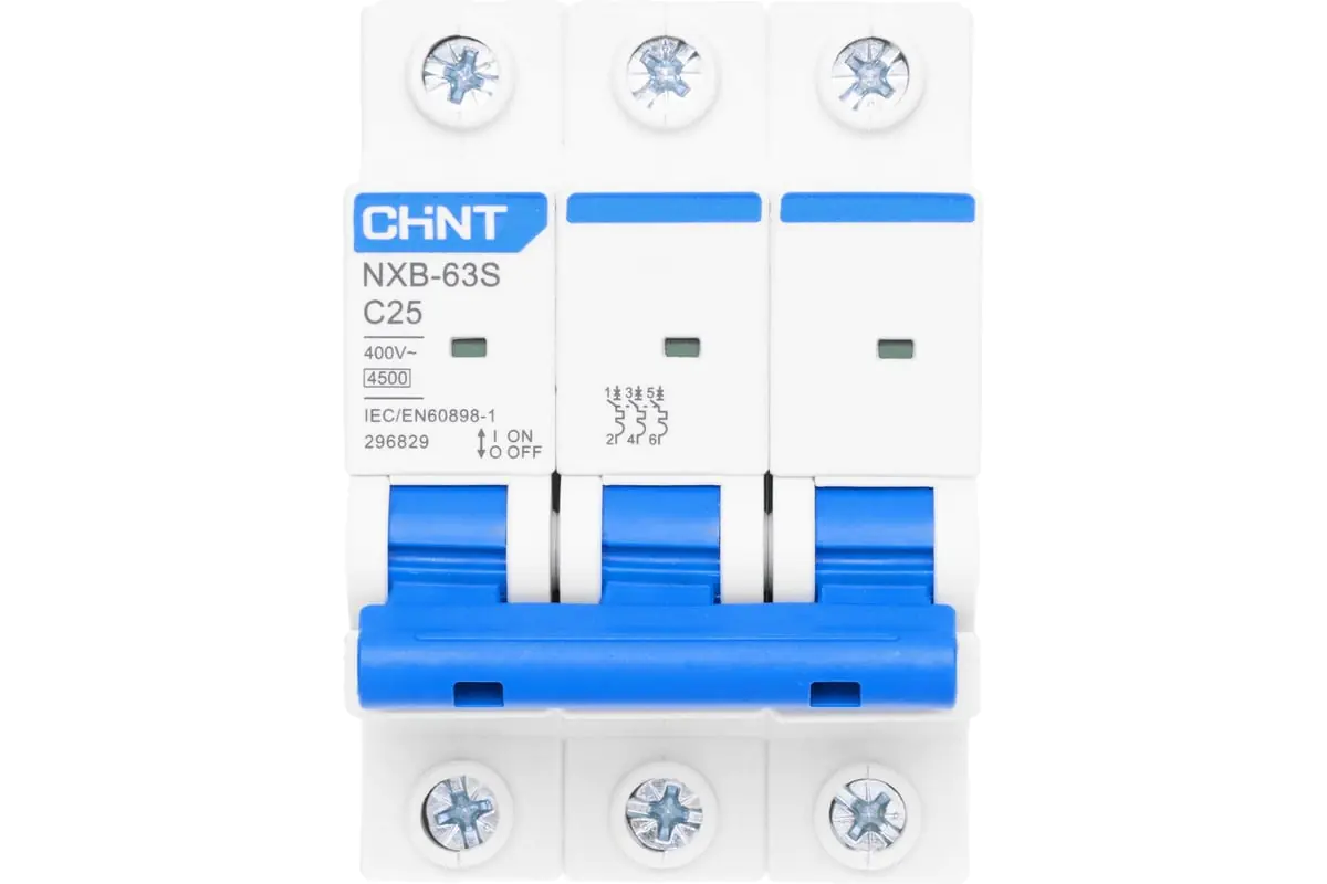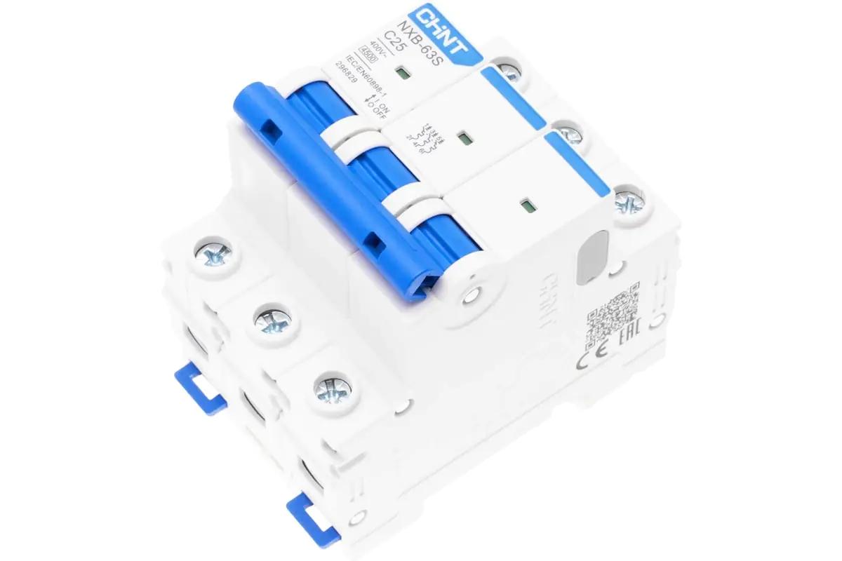 Автоматический выключатель CHINT NXB-63S 3P 25A 4,5кА тип C используется для защиты распределительных и групповых цепей от перегрузок и короткого замыкания. Применяется во вводно-распределительных щитах жилых и административных зданий или в промышленности.