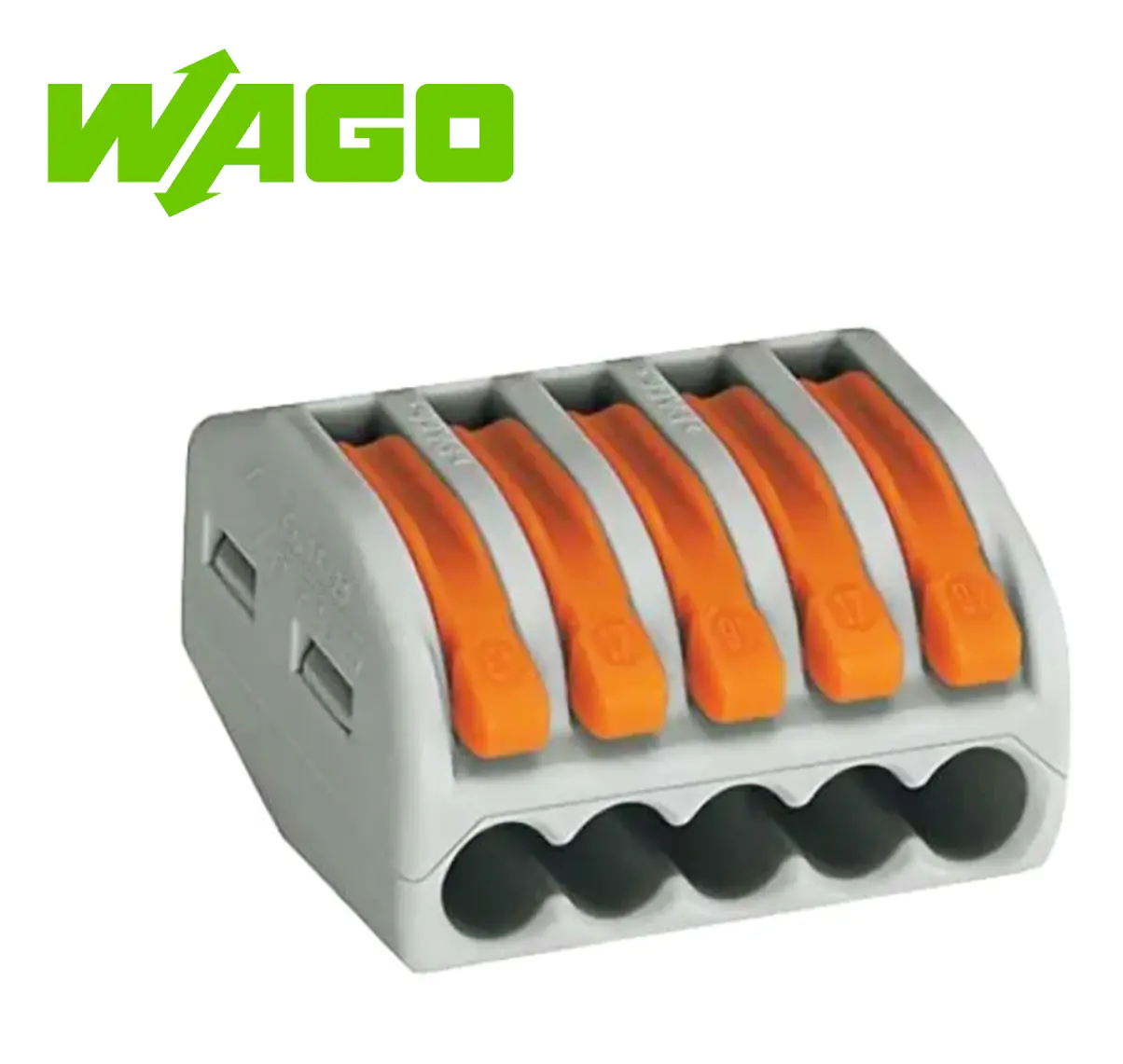 5-и проводная соединительная клемма Wago 222-415 – это особое приспособление, предназначенное для соединения одно- и многожильных алюминиевых и медных кабелей. Обеспечивает надёжное и безопасное соединение всех узлов проводки. Проводящая часть соединителя изготовлена из меди.