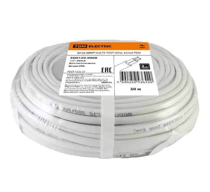 Шнур ШВВП 2х0,75 ГОСТ 50 м TDM Electric – это высококачественный кабель, который предназначен для передачи и распределения электрической энергии в стационарных установках. Проводник этого шнура выполнен из многопроволочной медной жилы (Cu), что обеспечивает его высокую проводимость и долговечность. Материал изоляции – ПВХ (поливинилхлорид), который обеспечивает надежную защиту от механических повреждений и высокую устойчивость к воздействию влаги. Шнур ШВВП 2х0,75 ГОСТ (50 м) имеет две жилы сечением 0,75 мм², что позволяет передавать и распределять электрическую энергию на номинальное переменное напряжение 0,66 и 1 кВ при номинальной частоте 50 Гц. Максимальная нагрузка составляет 0,38 кВт.