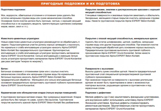 Альпина Бетон Контакт наносится на гладкие и плотные поверхности (либо слабо впитывающие поверхности, либо не впитывающие влагу поверхности) перед последующим оштукатуриванием, перед нанесением клеящих, армирующих составов, декоративных штукатурок и шпатлевок. Бетон контакт может применяться на основаниях со старыми покрытиями (даже по масляным и алкидным эмалям, дисперсионным краскам, минеральным штукатуркам). Alpina EXPERT Бетон-Контакт – прекрасное решение для подготовки бетонных поверхностей к последующей обработке и создания надёжного промежуточного сцепляющего слоя при внутренних или наружных работах.
