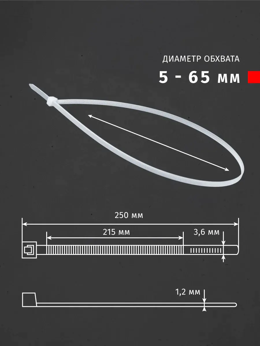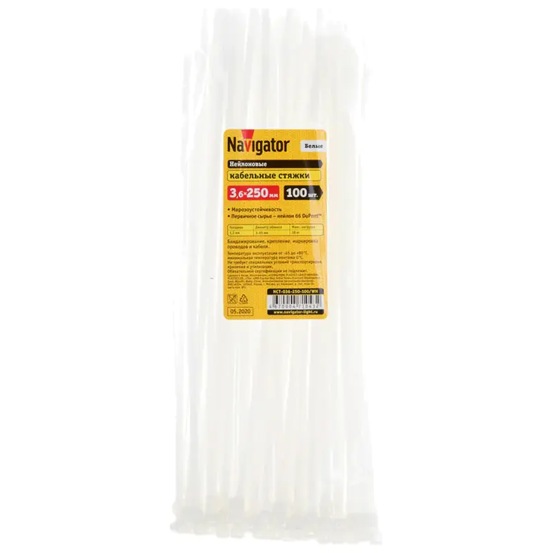 NCT-036-250-100/WH предназначены для увязки в пучок и монтажа кабелей и проводников. Хомуты изготовлены из негорючего нейлона и обладают стойкостью к щелочам, органическим растворителям и горюче-смазочным материалам. Температура эксплуатации кабельных стяжек от −40 до +80 °C. Ширина хомута составляет 3,6 мм, а его длина — 250 мм. В упаковке 100 штук.