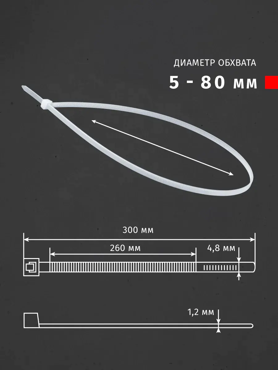 NCT-048-300-100/WH предназначены для увязки в пучок и монтажа кабелей и проводников. Хомуты изготовлены из негорючего нейлона и обладают стойкостью к щелочам, органическим растворителям и горюче-смазочным материалам. Температура эксплуатации кабельных стяжек от −40 до +80 °C. Ширина хомута составляет 4,8 мм, а его длина — 300 мм. В упаковке 100 штук.