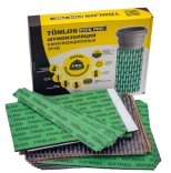 Оба материала комплекта TONLOS PIPE PRO является самоклеящимся и не требует использования дополнительных клеевых материалов. Материалы не нуждаются в подгонке и уже на заводе вырезаны в размер для стандартной канализационной трубы Ø110 мм. В комплекте предусмотрены специальные листы для раструбов, компенсаторов, тройников и ревизий с нанесенной перфорацией, которая помогает быстро и точно сформировать отверстие для отводящего патрубка (Ø110 мм, Ø50 мм) или ревизионного лючка. Для достижения максимальной шумоизоляции в комплекте предусмотрены специальные звукоизоляционные самоклеящиеся ленты для изоляции стыков. Комплект предназначен для труб длиной до 3,2 м.