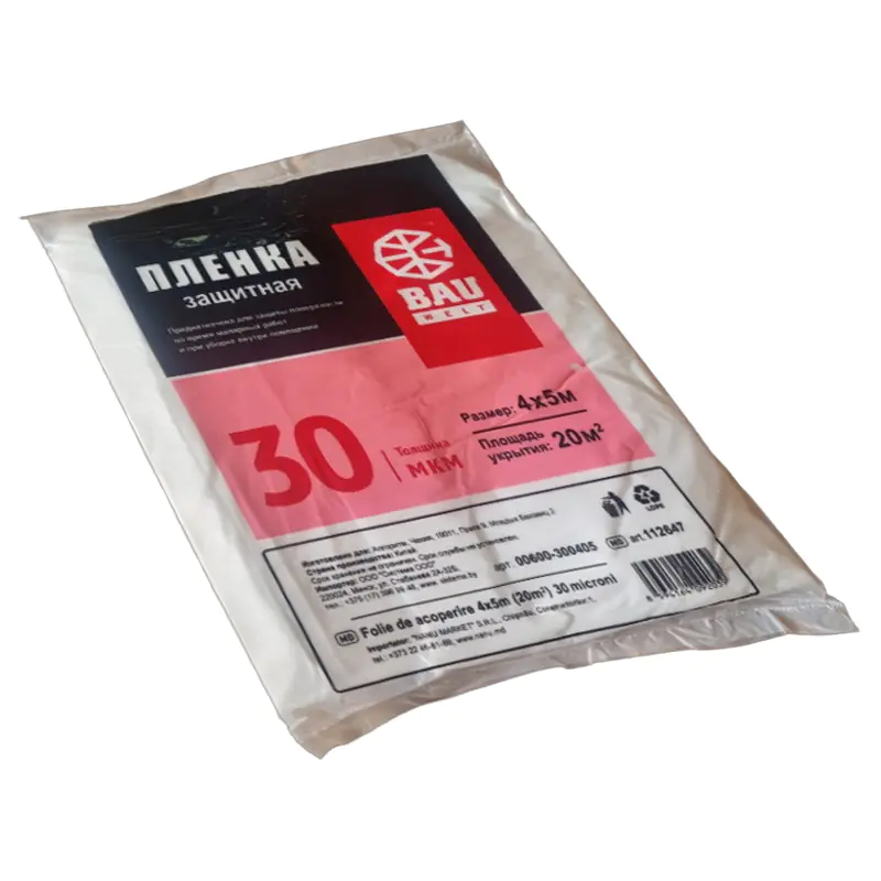 Плёнка укрывная 30 мкм Bauwelt служит для защиты поверхности во время малярных работ и при уборке внутри помещений, плотность средняя. В упаковке 20 м.кв.