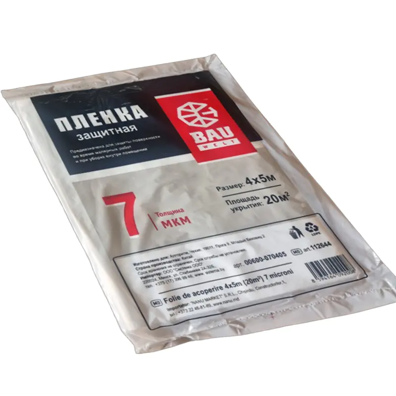 Плёнка укрывная 7 мкм Bauwelt служит для защиты поверхности во время малярных работ и при уборке внутри помещений, плотность средняя. В упаковке 20 м.кв.