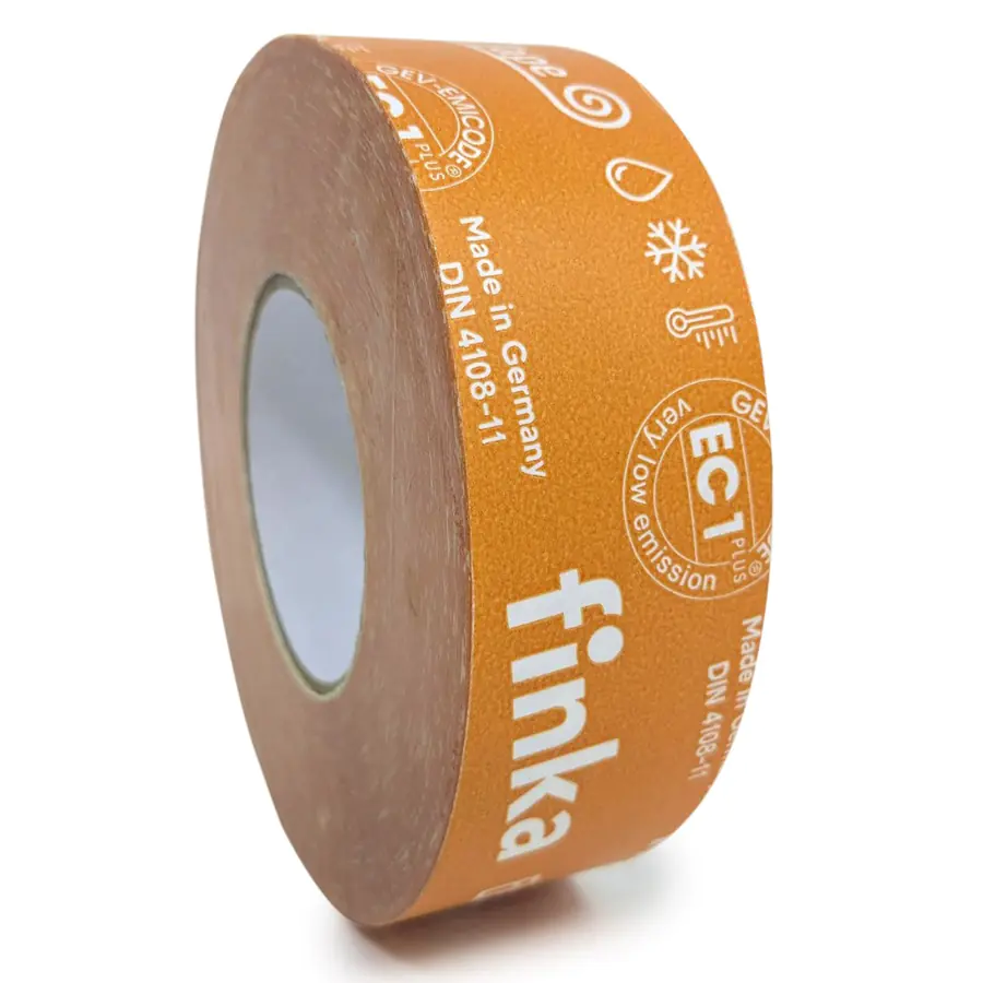 Finka Inside Tape прочная на разрыв герметизирующая клейкая лента на бумажной основе со специальным акриловым клеем с высокой адгезией и устойчивостью к старению. Для внутренних работ. Разработана и произведена в Германии специально для применения в сложных климатических зонах. Finka Inside Tape устойчива к жаре, холоду и к влаге. Применяется для герметичного склеивания слоёв пароизоляционных плёнок, стеновых панелей, плитных материалов, CLT панелей. Основа ленты специальная бумага, за счет этого с лентой удобно работать в углах и вокруг стропил, лента не имеет растяжения, за счёт этого отсутствует риск образования складок. При работе можно обойтись без ножа. Лента дополнительно покрыта ламинацией с УФ защитой.