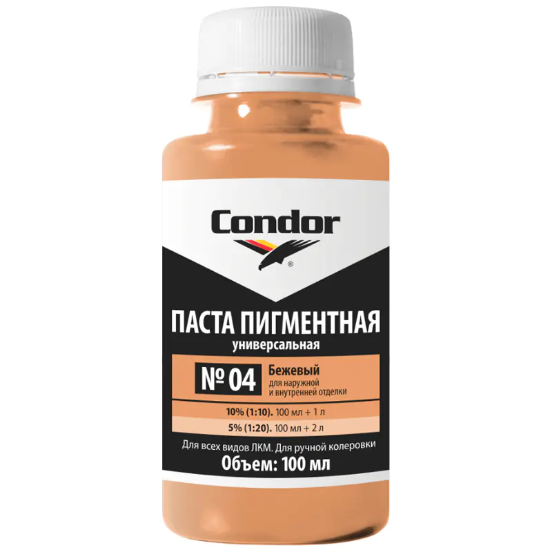 Паста пигментная Condor предназначена для колеровки водно-дисперсионных, алкидных, масляных, цементных и цементноизвестковых составов. Цвет: бежевый.