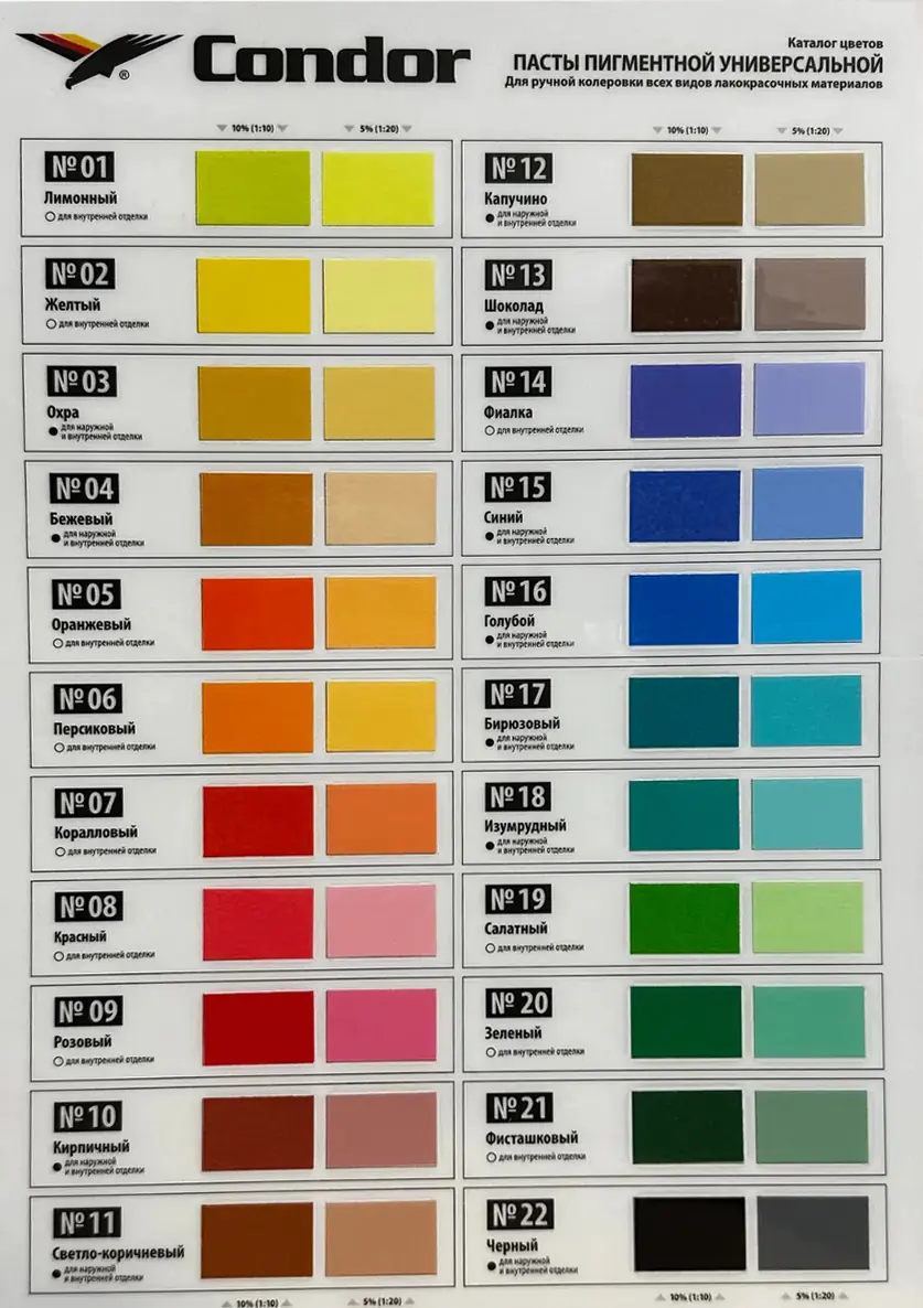 - Краситель с номерами 01, 02, 05, 06, 07, 08, 09, 14, 19, 20, 21, применяются только внутри помещений.