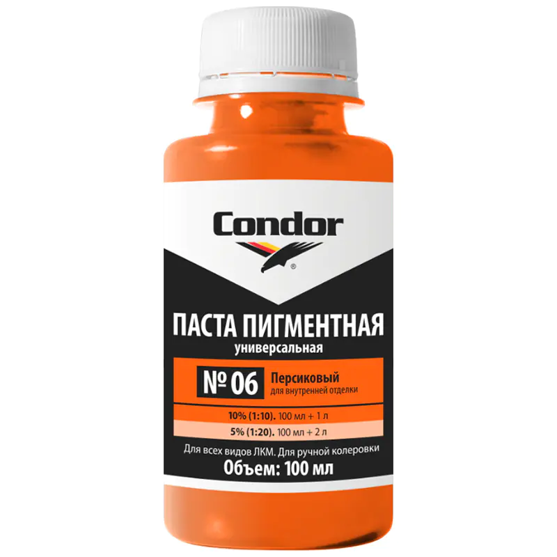 Паста пигментная Condor предназначена для колеровки водно-дисперсионных, алкидных, масляных, цементных и цементноизвестковых составов. Цвет: персиковый.