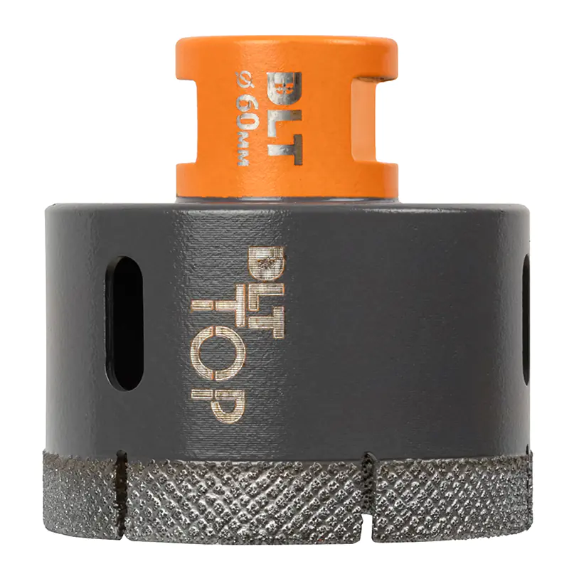 Алмазная коронка DLT TOP 60 мм выполнена по технологии вакуумно-жидкостного спекания, при котором алмазы расположены в строго распределенном порядке за счет чего коронки позволяют производить быстрое и чистое сверление с минимальными сколами. При этом сохраняется высокая скорость сверления и ресурс, даже без использования водяного охлаждения.