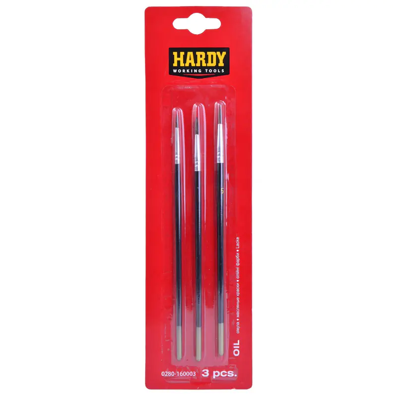 Набор из 3-х кистей HARDY предназначен для работ по покраске небольших поверхностей, труднодоступных мест и отделке деталей, а также для художественных работ на холсте, бумаге, оргалите и других поверхностях. Кисти изготовлены из натуральной щетины китайской свиньи, что гарантирует точность и равномерность окраски. Имеют удобную деревянную ручку и металлический бандаж. Подходят для любых красок и масла. Сохраняет свою форму в течении долгого времени. В упаковке 3 кисти.