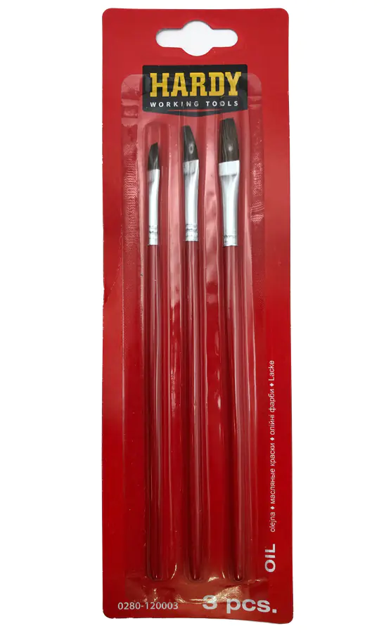 Набор плоских художественных кистей Hardy 0280-12 00 03 для масляных красок. Используются для художественной росписи и для работ, связанных с покраской небольших участков, труднодоступных мест и отделкой деталей. В упаковке 3 кисти. Цена за упаковку.