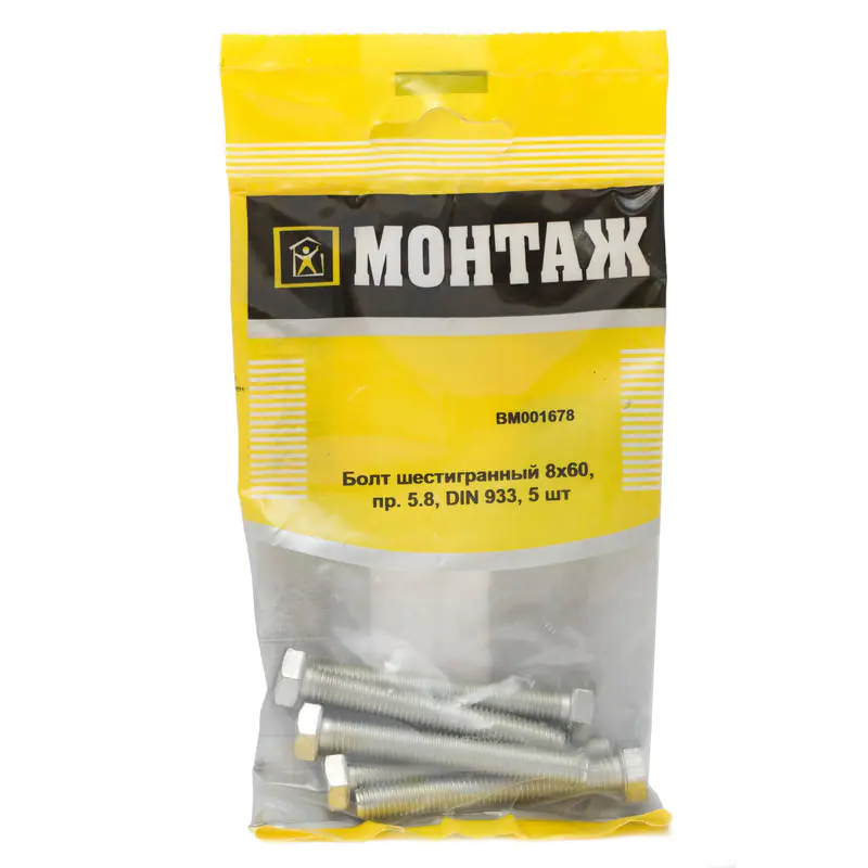 Болт с шестигранной головкой М8х60 применяется для соединения и крепления деталей в машиностроении и приборостроении, в мебельном производстве и в строительной сфере. Диаметр составляет 8 мм, длина - 60 мм. В упаковке 5 шт.