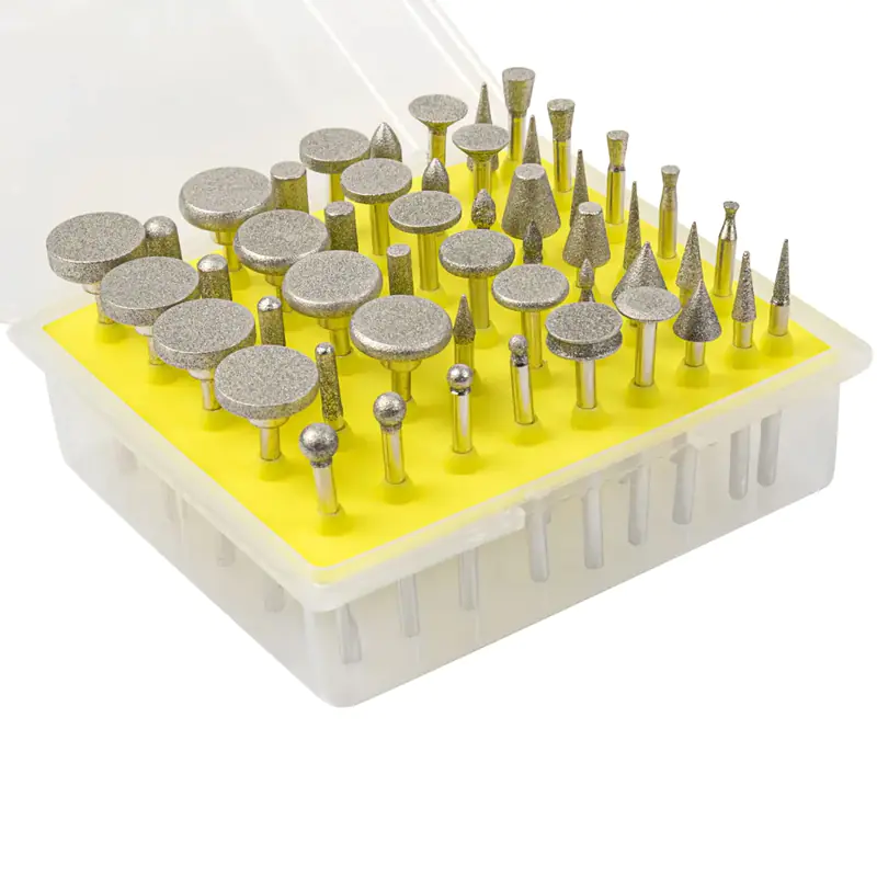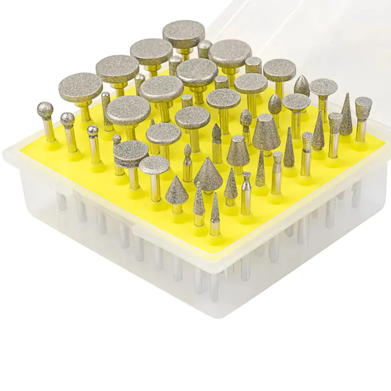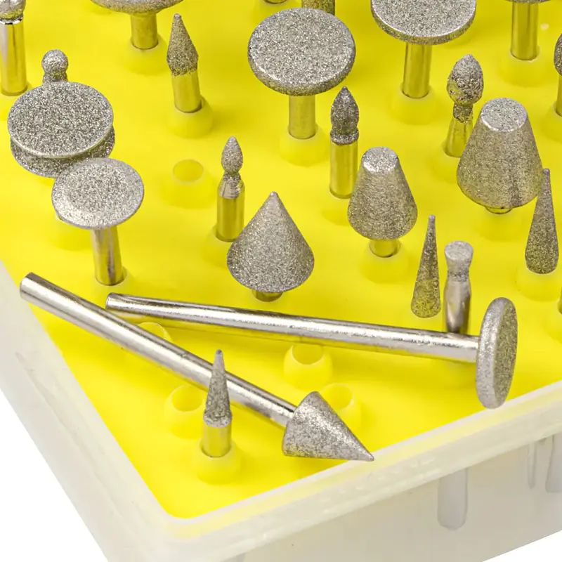 Набор алмазных фрез для гравировальной машинки, 50 шт (шарошки для гравера) применяются для проведения высокоточной обработки цветных металлов, стекла, керамики, керамогранита, пластика и прочих материалов. У всех буров хвостовик 3 мм, что позволяет использовать их не только в бор-машинках, но и в гравировальных аппаратах. Равномерное нанесение алмазного порошка на поверхность рабочей части обеспечивает качественную и аккуратную обработку материала без сколов и заусенцев. Нанесение из высококачественных синтетических алмазов. Ассортимент насадок различных форм позволяет обрабатывать самые сложные участки деталей разной конфигурации.