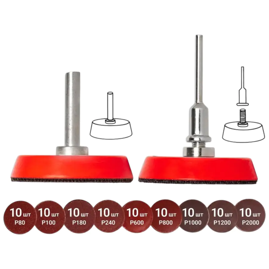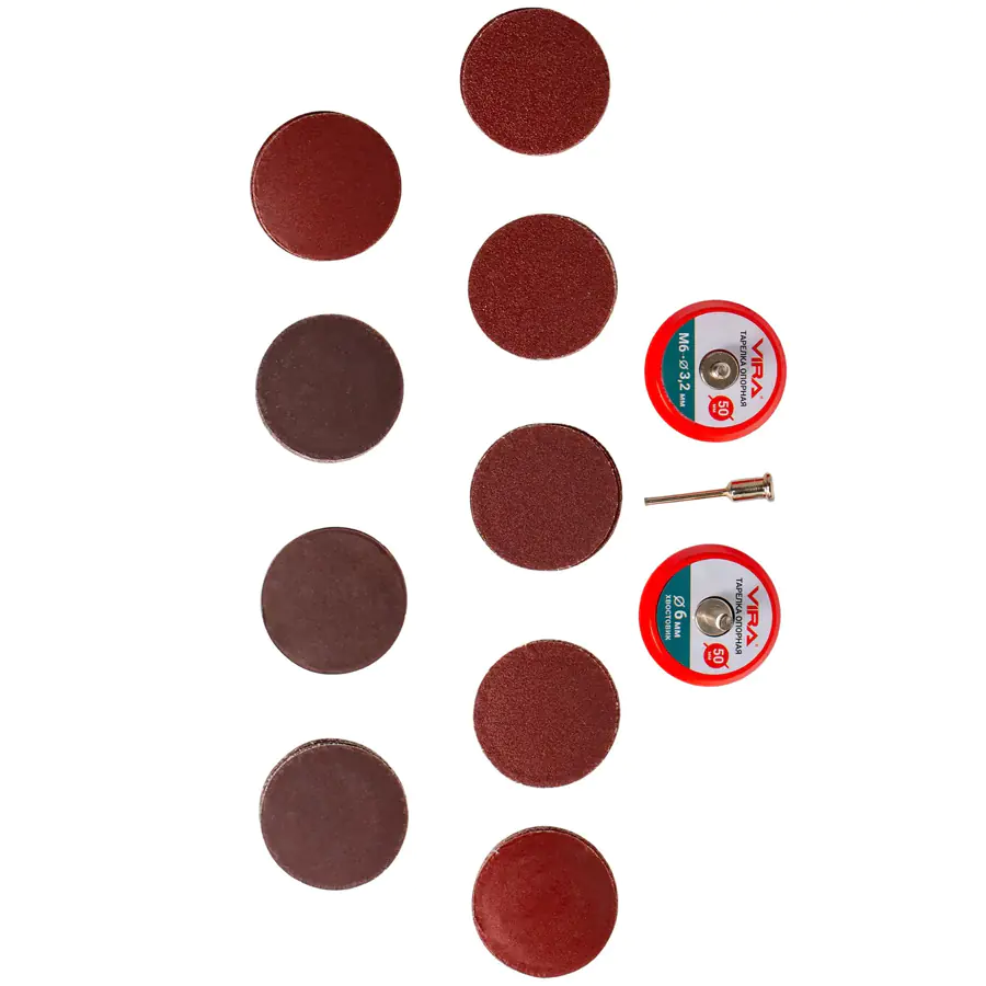 - Тарелка опорная со съемным хвостовиком: крепление абразивных дисков на липучке, хвостовик 3,2 мм, посадка M6.