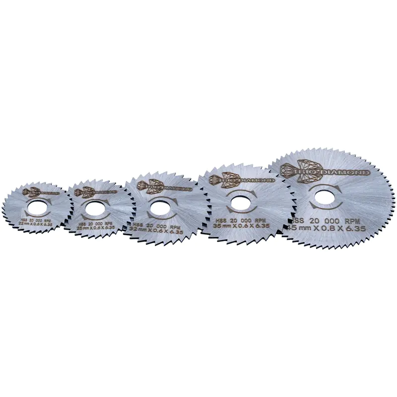 Набор пильных дисков по металлу HSS 22/25/32/35/45 мм Trio-diamond 141805 для гравировальной машинки. Предназначены для работы с металлом, пластиком, древесиной.
