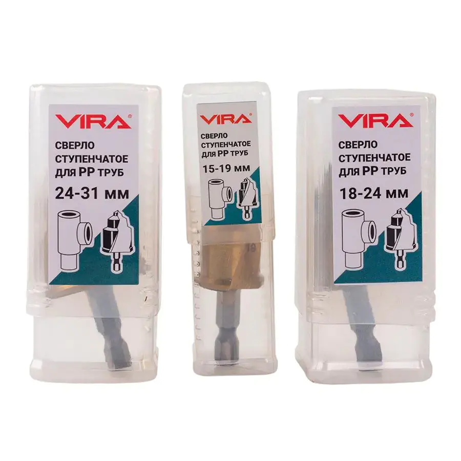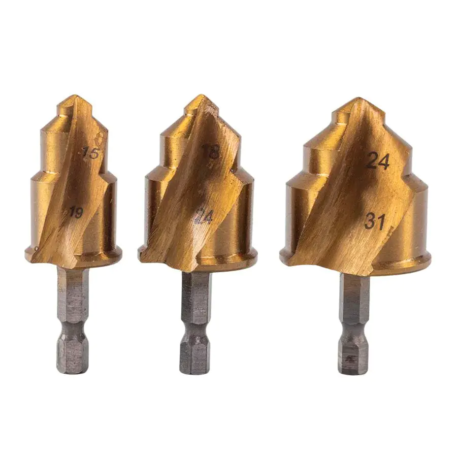 Набор ступенчатых спиральных сверл для полипропиленовых труб 15-19, 18-24, 24-31 мм предназначен для расширения фитингов водопроводных пластиковых труб. Сверло позволяет расширять отверстия ранее уже спаянных фитингов до необходимых размеров для повторной пайки труб. Конструкция сверла обеспечивает оптимальный отвод стружки из зоны сверления. Специальная спиральная канавка служит для увеличения плавности и скорости работы по сравнению с обычным ступенчатым сверлом. Изготовлены из высококачественной стали, что повышает долговечность и износостойкость инструмента. Шестигранный хвостовик 1/4'' НЕХ позволяет устанавливать сверла как в зажимной патрон электроинструмента, так и в патрон типа HEX.