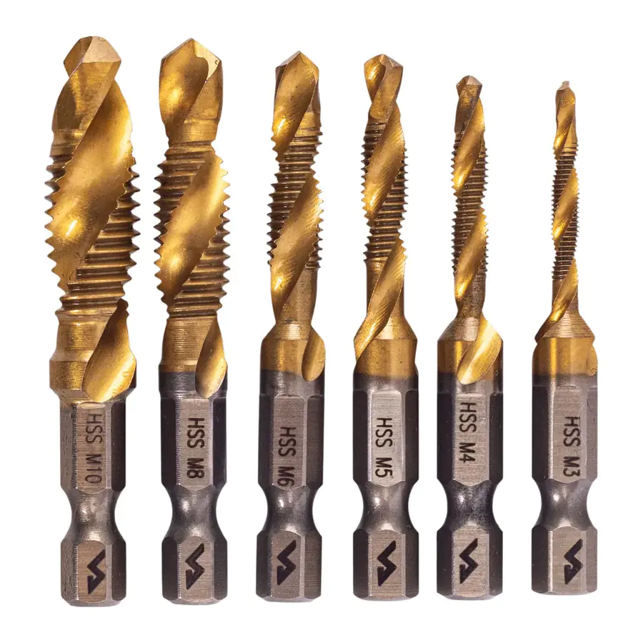 Набор сверл-метчиков предназначен для сверления отверстий и одновременного нарезания резьбы. Сверла изготовлены из высококачественной быстрорежущей стали HSS4241, которая увеличивает износостойкость инструмента. Нитридтитановое покрытие обеспечивает дополнительную износостойкость. В результате увеличивается срок службы и качество работы. А шестигранный хвостовик надёжно фиксируется в патроне инструмента.