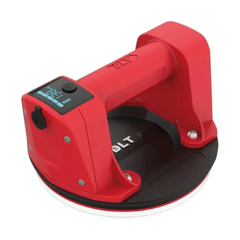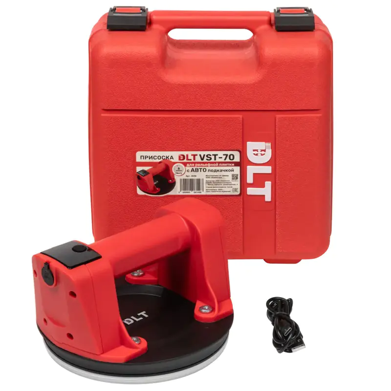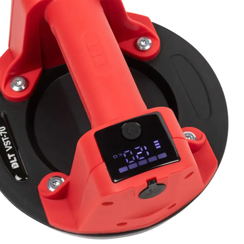 Присоска DLT VST-70 оснащена встроенным электрическим насосом, датчиком давления, дисплеем для визуального контроля уровня заряда батареи и массы удержания. Датчик давления анализирует силу разрежения воздуха и автоматически включает насос, когда требуется восстановить необходимые параметры вакуума (автоматическая подкачка).