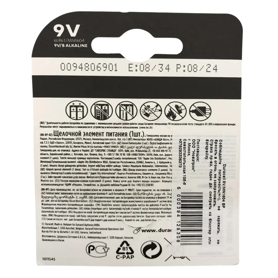 Щелочная батарейка DURACELL 9V/MN1604 BP используется для энергоемких устройств: цифровые камеры, фотовспышки, электронные игрушки и т.д. Также подойдет для часто используемых устройств: фонариков, электробритв, электрических зубных щеток. Типоразмер 6LR61 (Крона). Напряжение 9В. Упаковка 1 шт.