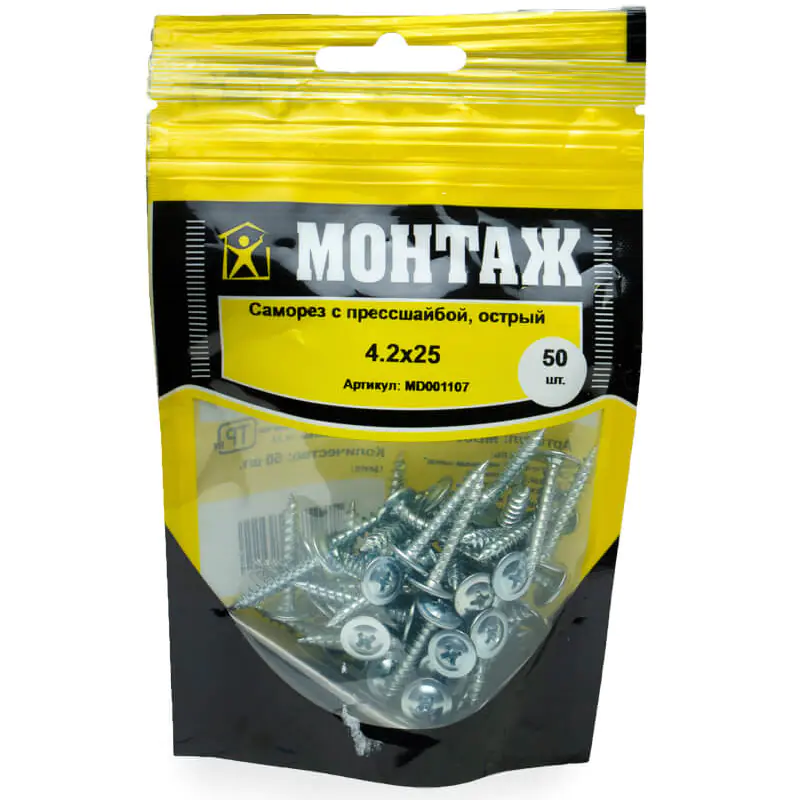 Саморез с прессшайбой 4,2x25 (50 шт) острый предназначен для надежного крепления стальных и других листовых материалов к металлическим (до 0,9 мм) и деревянным конструкциям. Он обеспечивает прочное соединение и удобство монтажа.