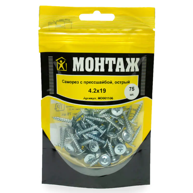 Саморез с прессшайбой 4,2x19 (75 шт) острый предназначен для надежного крепления стальных и других листовых материалов к металлическим (до 0,9 мм) и деревянным конструкциям. Он обеспечивает прочное соединение и удобство монтажа.