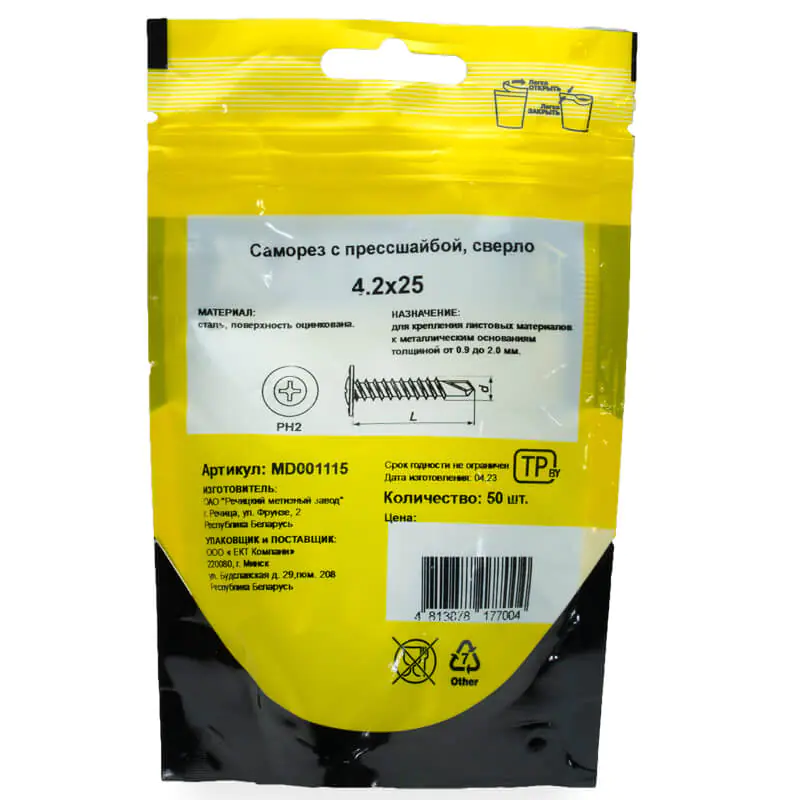 Саморез с прессшайбой 4,2x25 (50 шт) со сверлом предназначен для надежного крепления стальных и других листовых материалов к металлическим (до 2 мм) и деревянным конструкциям. Он обеспечивает прочное соединение и удобство монтажа.