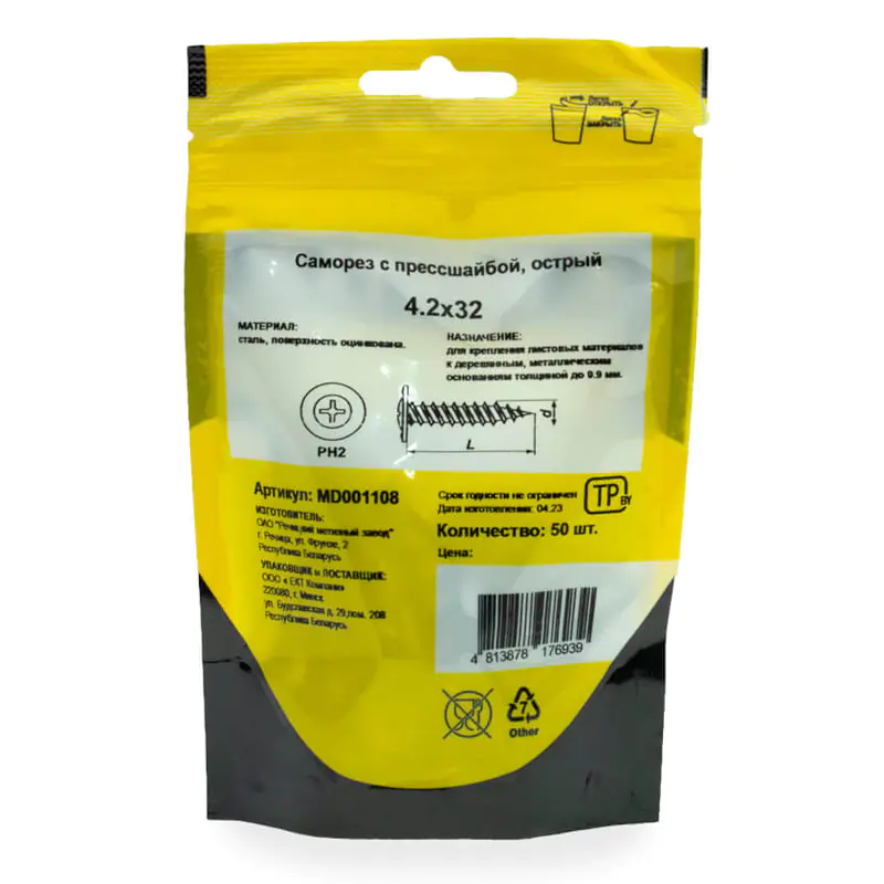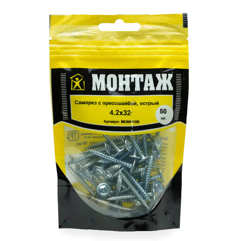 Саморез с прессшайбой 4,2x32 (50 шт) острый предназначен для надежного крепления стальных и других листовых материалов к металлическим (до 0,9 мм) и деревянным конструкциям. Он обеспечивает прочное соединение и удобство монтажа.