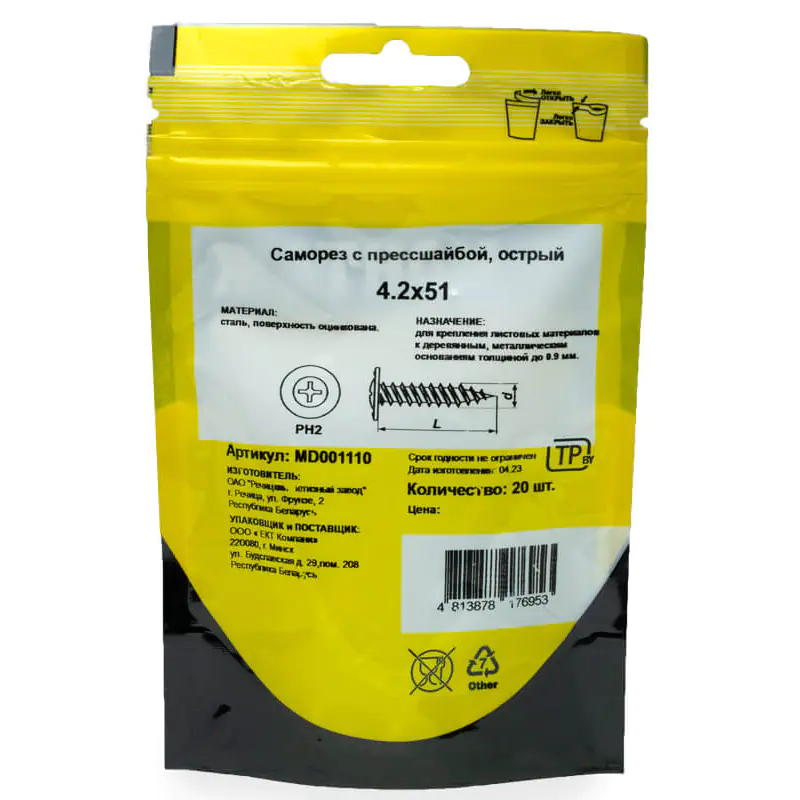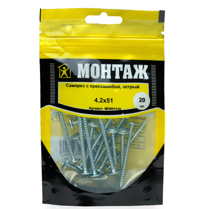 Саморез с прессшайбой 4,2x51 (20 шт) острый предназначен для надежного крепления стальных и других листовых материалов к металлическим (до 0,9 мм) и деревянным конструкциям. Он обеспечивает прочное соединение и удобство монтажа.