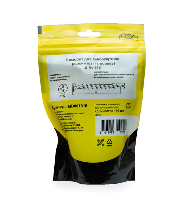 Саморез 4,2х110 мм предназначен для надежного крепления гипсокартона к деревянной подконструкции. Изготовлен из стали, поверхность фосфатирована или оксидирована, что придает ему дополнительную прочность и защиту от коррозии. Наконечник острый, головка потайная с крестообразным шлицем РН2.