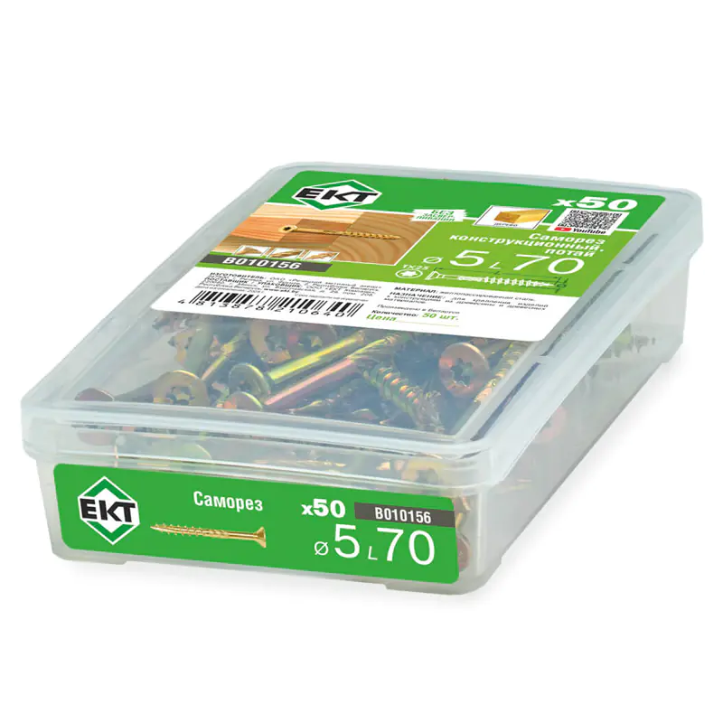 Саморез конструкционный 5х70 мм потай, желтый цинк широко используется в деревянном домостроении для скрепления несущих деревянных конструкций, каркасов, стропил, балок и других силовых опор. Не расщепляет древесину. Не требует предварительного засверливания. Возможность скрытого монтажа. В упаковке 50 штук.
