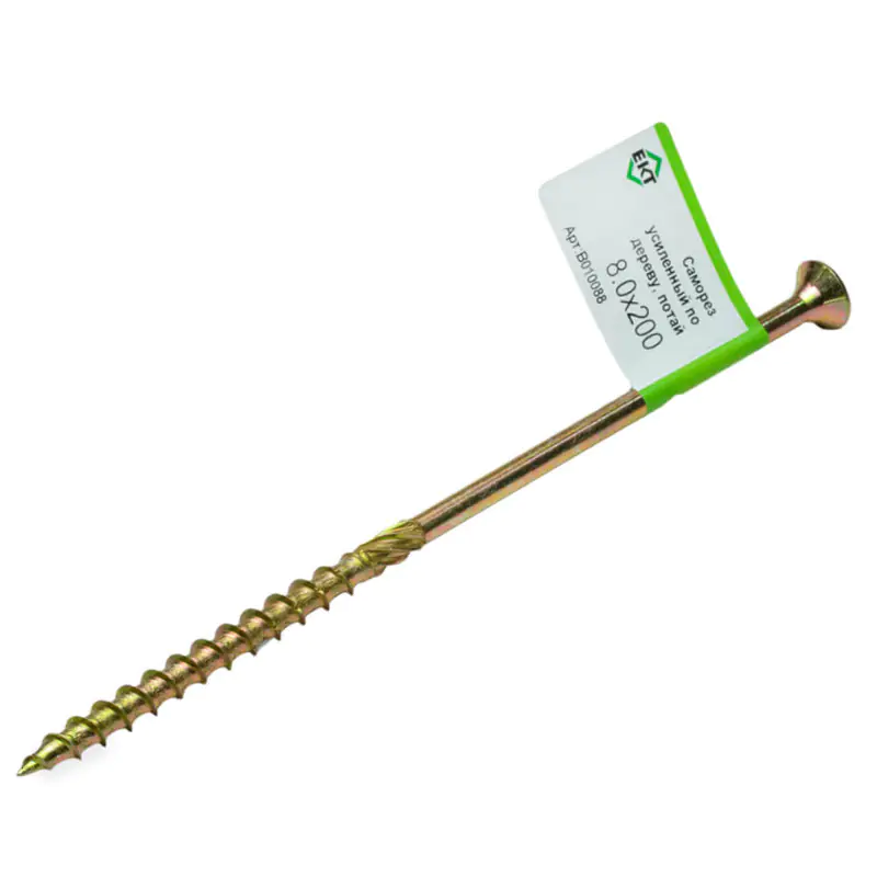 Саморез конструкционный 8*200 мм подходит для твердых сортов древесины. Рассчитан на высокие нагрузки и суровые условия эксплуатации.