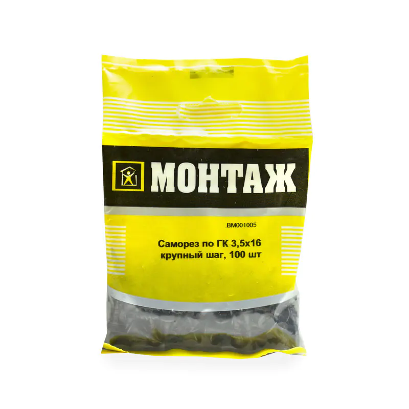 Саморез 3,5х16 (100 шт) с крупным шагом предназначен для надежного крепления гипсокартона к деревянной подконструкции. Изготовлен из стали, поверхность фосфатирована или оксидирована, что придает ему дополнительную прочность и защиту от коррозии. Наконечник острый, головка потайная с крестообразным шлицем РН2. Шаг резьбы редкий.