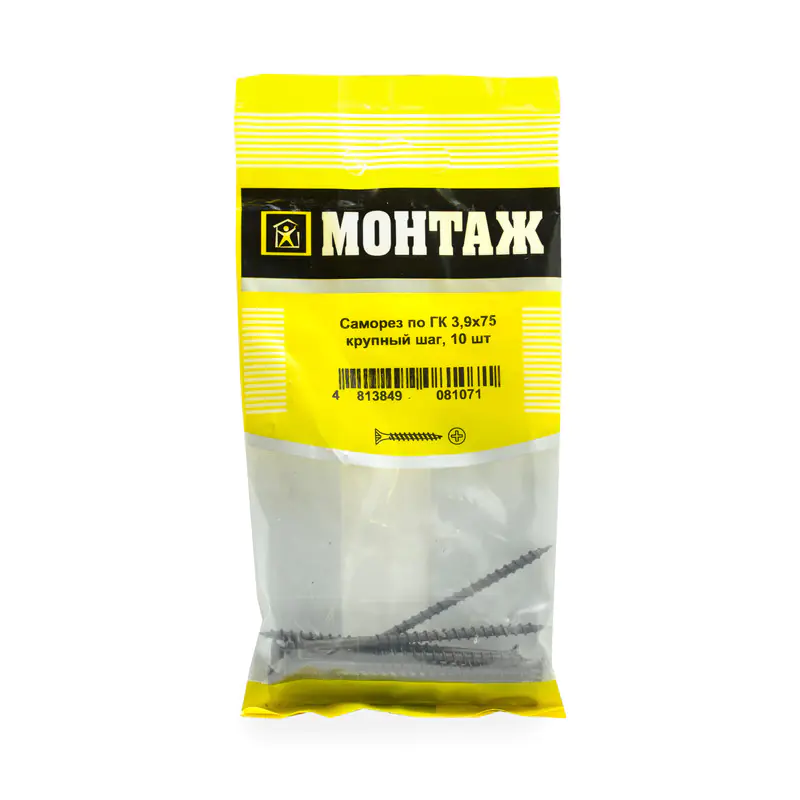 Саморез 3,9х75 (10 шт) с крупным шагом предназначен для надежного крепления гипсокартона к деревянной подконструкции. Изготовлен из стали, поверхность фосфатирована или оксидирована, что придает ему дополнительную прочность и защиту от коррозии. Наконечник острый, головка потайная с крестообразным шлицем РН2. Шаг резьбы редкий.