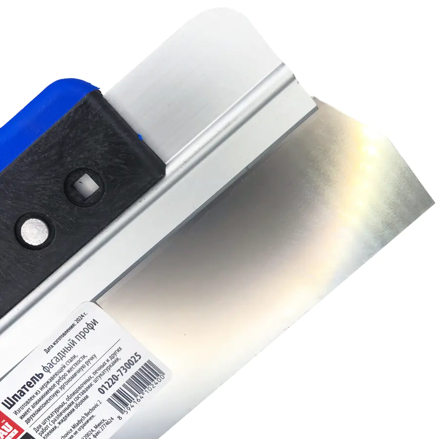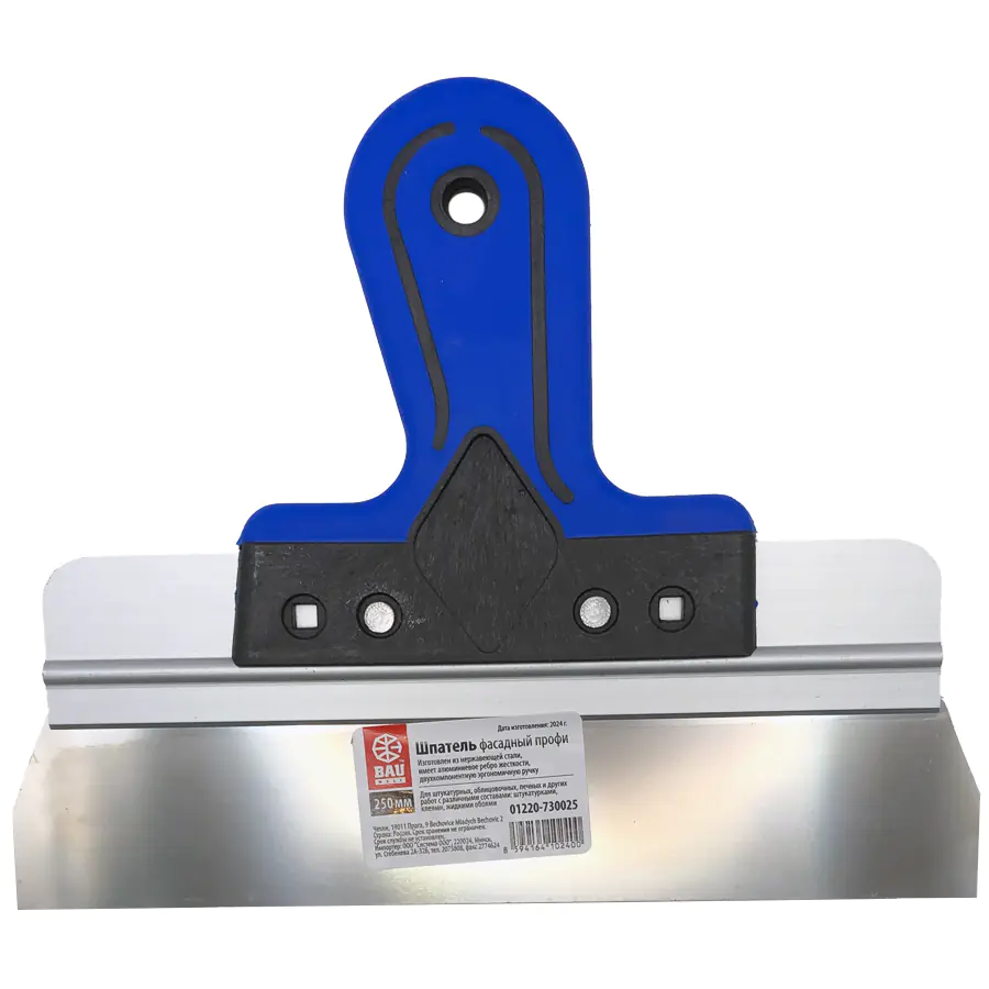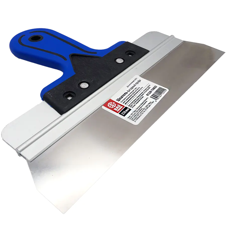Шпатель фасадный Bauwelt 25 см изготовлен из нержавеющей стали толщиной 0,5 мм, имеет алюминиевое ребро жесткости, которое предотвращает искривление полотна, двухкомпонентную эргономичную ручку, обеспечивающую надежный захват инструмента.