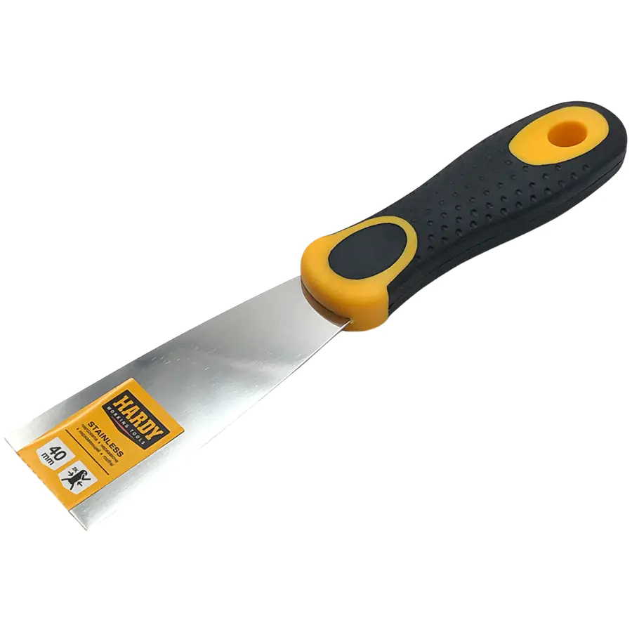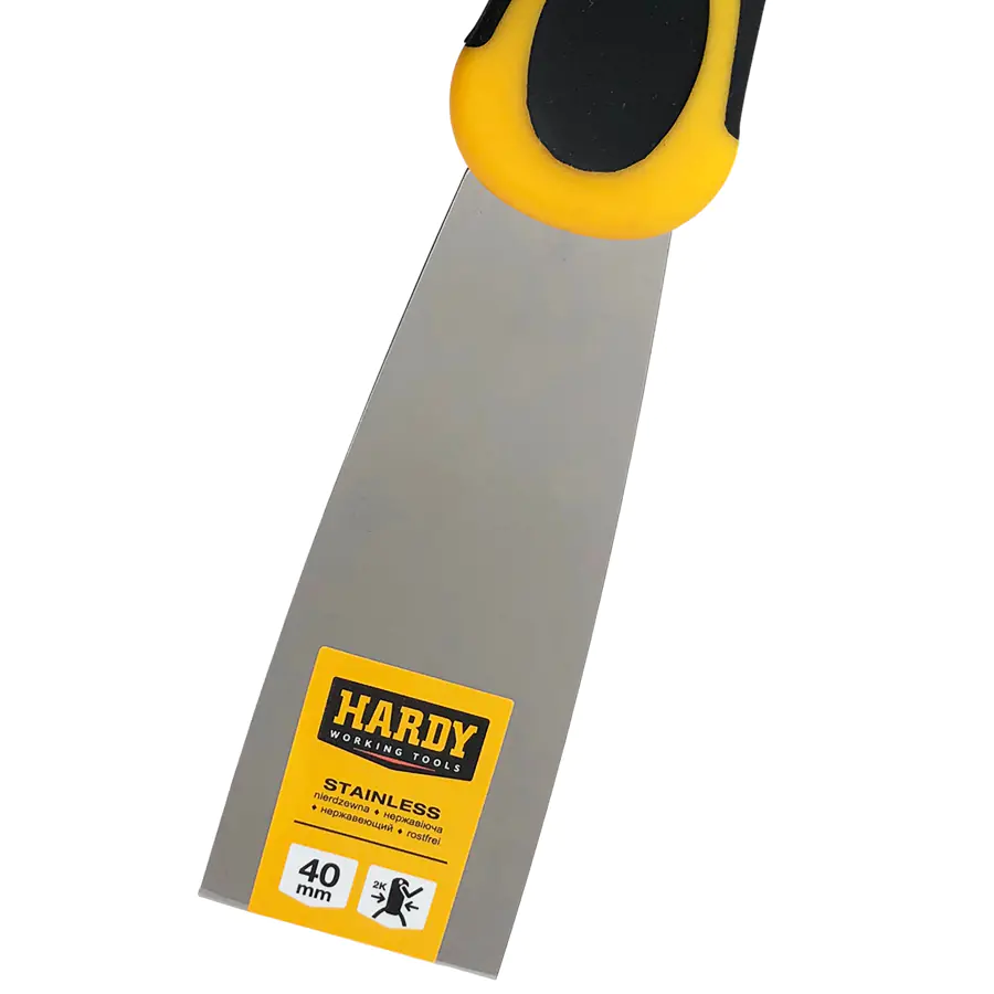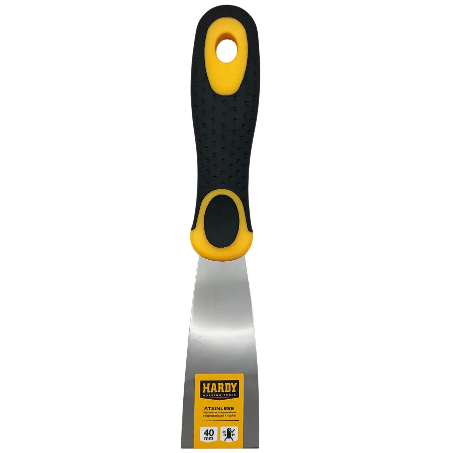 Профессиональный шпатель Hardy малярный из эластичной нержавеющей стали для нанесения и разглаживания шпатлевки. Двухкомпонентная рукоятка предотвращает скольжение и обеспечивает надежное сцепление. Ширина 4 см.