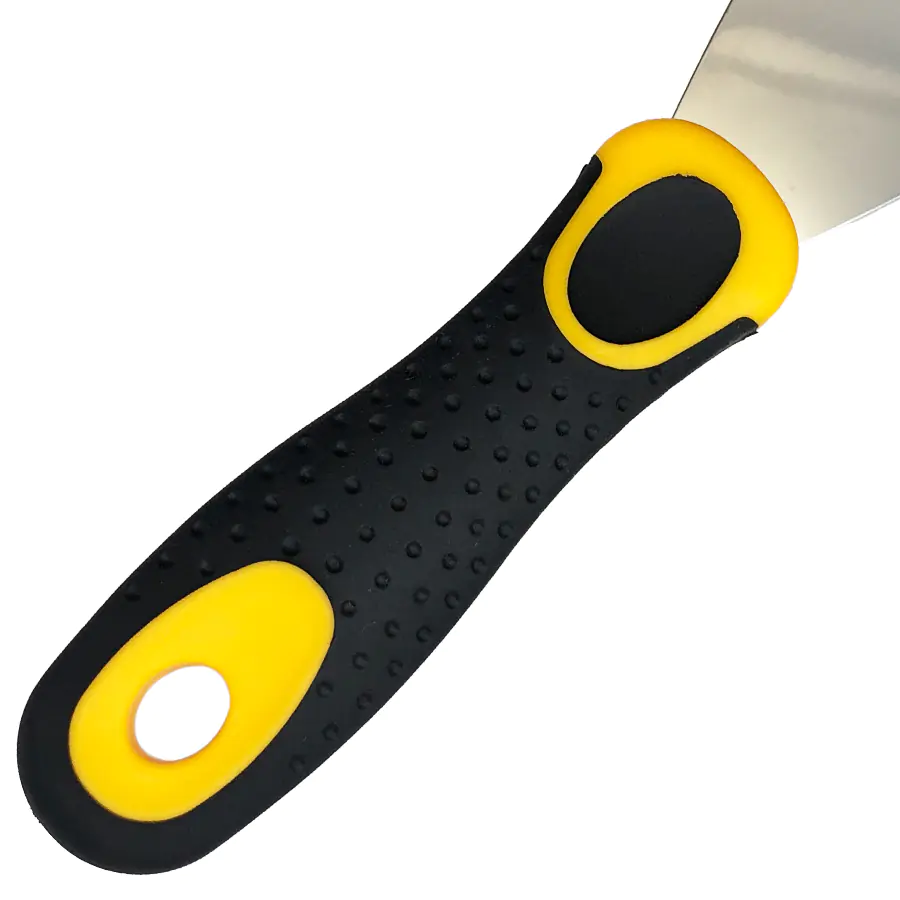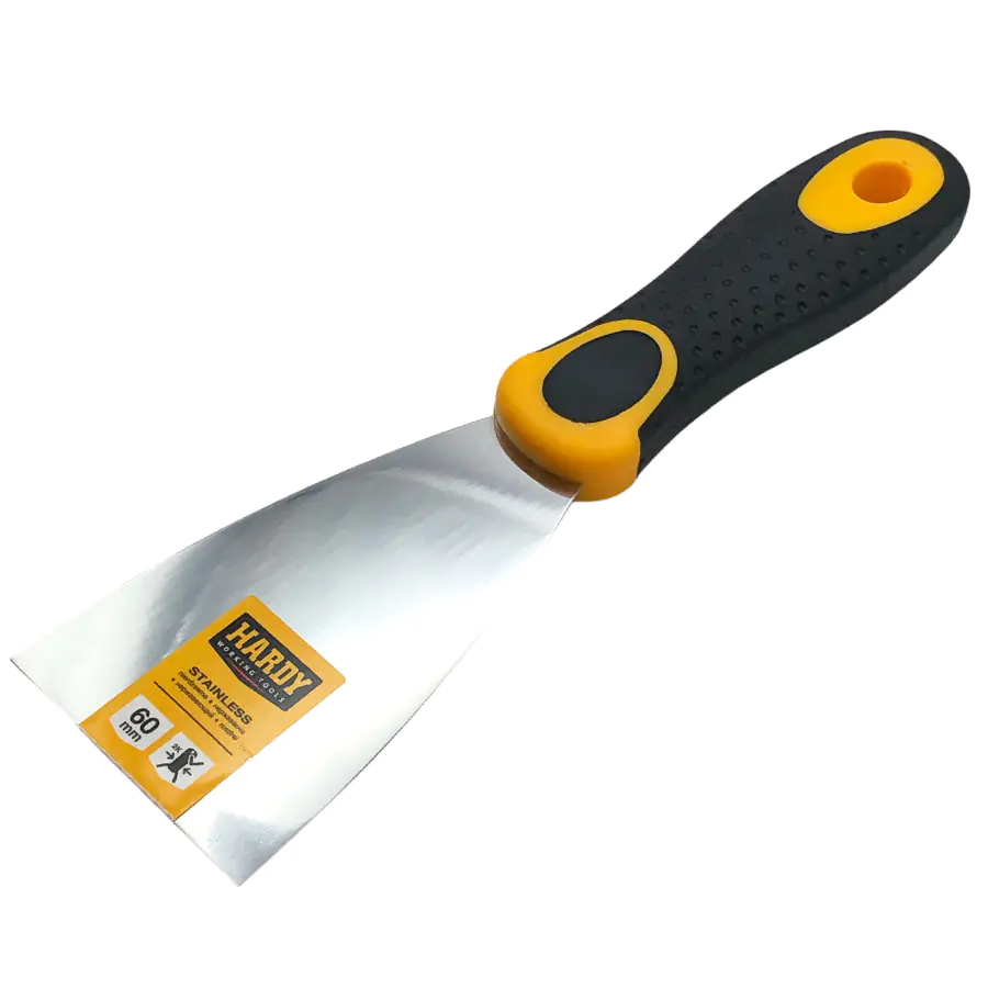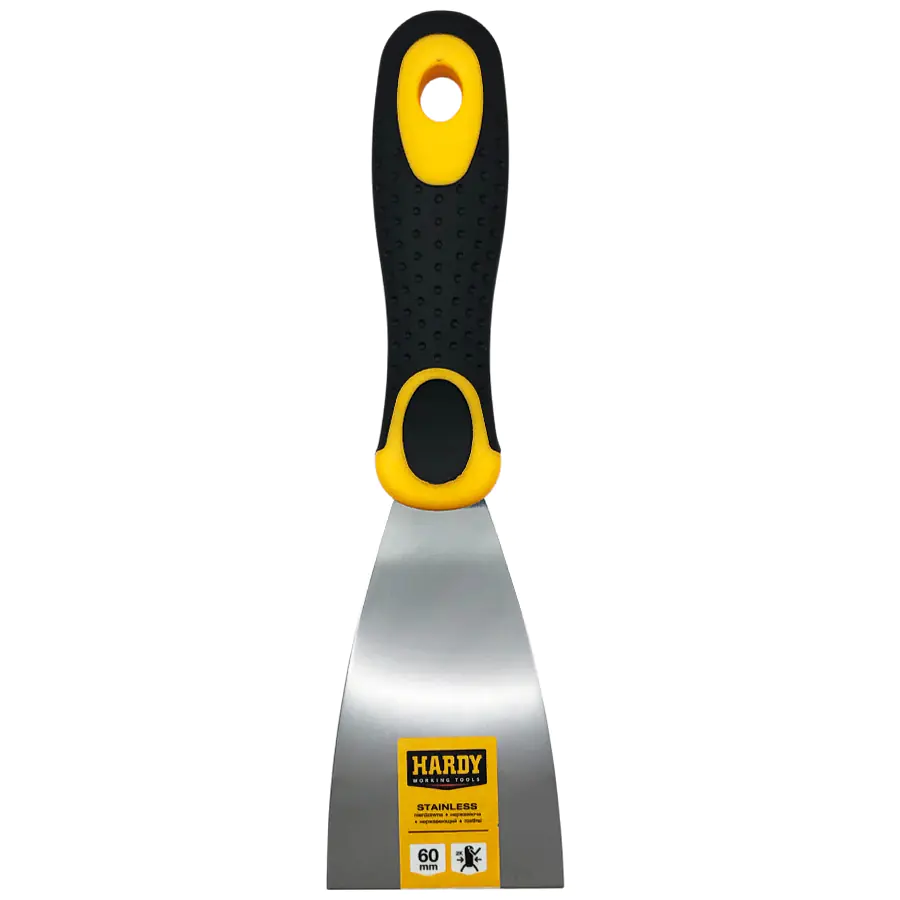Профессиональный шпатель Hardy малярный из эластичной нержавеющей стали для нанесения и разглаживания шпатлевки. Двухкомпонентная рукоятка предотвращает скольжение и обеспечивает надежное сцепление. Ширина 6 см.