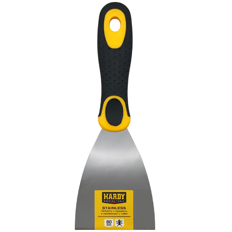 Профессиональный шпатель Hardy малярный из эластичной нержавеющей стали для нанесения и разглаживания шпатлевки. Двухкомпонентная рукоятка предотвращает скольжение и обеспечивает надежное сцепление. Ширина 8 см.