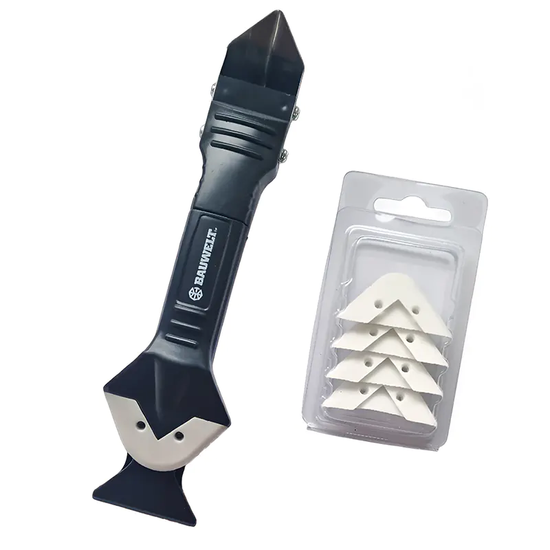 Скребок-шпатель 3 в 1 для удаления и выравнивания герметика Bauwelt – универсальный инструмент для отделочных работ. Подходит для удаления старого герметика, очистки и затирки швов, а также аккуратного выравнивания нанесенного состава. В набор входит 5 сменных насадок, что делает инструмент удобным для разных задач и типов швов.