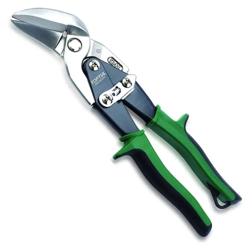 Ножницы по металлу TOPTUL SBAD0224 предназначены для фигурной резки холоднокатаной листовой стали толщиной до 1,2 мм, легированной низкоуглеродистой стали до 0,7 мм. Лезвия ножниц изготавливаются ковкой из легированной стали с повышенным содержанием хрома и молибдена, с последующей индукционной закалкой режущих кромок до 60-82 единиц твердости по шкале Роквелла. Эргономичность инструмента обеспечивают двухкомпонентные нескользящие рукояти. Изогнутый профиль инструмента позволяет выполнять резку под углом относительно заготовки и увеличивает рычаг давления, что снижает усилие при резании. Длина лезвий составляет 35 мм.